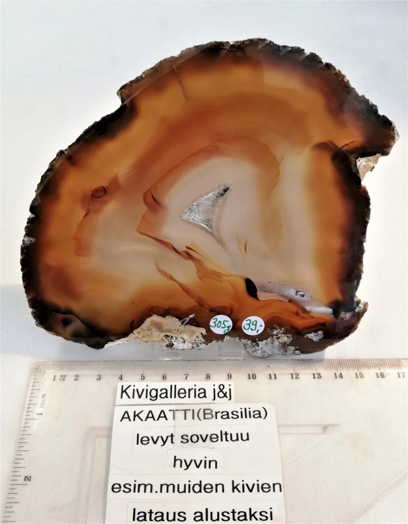 Upea 305g painoinen Akaattilevy, koko n. 0,8x13x15cm. Akaatti on voimakas tunteellinen parantaja ja se tasapainottaa energiajärjestelmän feminiinisiä ja maskuliinisia puolia. Akaatti antaa kantajalleen rohkeutta ja itseluottamusta. Ne ovat myös loistavia meditointikiviä. Akaattilevyn voimat lataavat myös muita kiviä voimistaen niiden vaikutuksia.