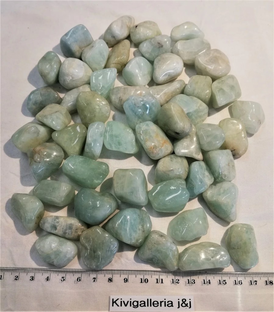 Upeita vihreän/sini-sävyisiä AQ-laatuisia rumpuhiottuja Akvamariineja, koko n. 2-2,5 x 2,5-3,5cm. Akvamariini lievittää stressiä antamalla rohkeutta ja tyyneyttä. Se auttaa kommunikoimaan rauhallisesti ja selkeästi. Kivi myös virkistää aivoja ja tukee mielen toimintoja sekä laajentaa oppimiskykyä. Tehostaa keskittymistä. Akvamariini huuhtelee lempeästi tukokset pois chakroista, jolloin energian virtaaminen tehostuu. Chakra: Kurkkuchakra.