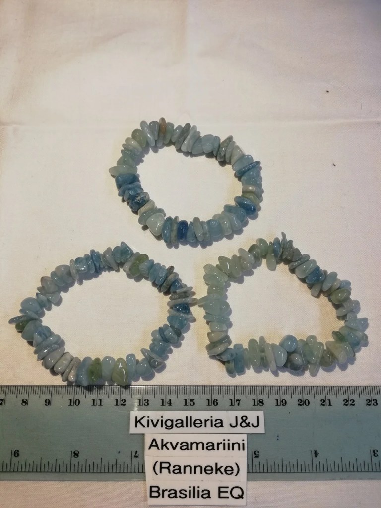 Upea Akvamariini rumpukivi ranneke,jota muinaisen perinteen mukaan tätä kaunista sinivihreää kiveä kutsuttiin merenneitojen aarteeksi,sekä uskottiin muinaisina aikoina torjuvan pimeyden voimia ja kutsuvan valon henkien suojaa ja suosiota.Akvamariini lievittää stressiä antamalla tyyneyttä ja vahvistamalla rohkeutta,virkistäen aivoja,laajentaen oppimiskykyä ja tukien mielen toimintoja.Akvamariini on myös erinomainen apu meditaatiossa,sillä se kohottaa tietoisuuden tasoa,kehittäen ihmistä henkisesti.Akvamariini saa ihmisen tutkimaan sisintään ja korkeampaa minäänsä,jotta hän löytäisi totuuden,kannustaen ottamaan vastuuta omista teoistaan,,lisäten myötätuntoa ja kärsivällisyyttä.Fyysisesti Akvamariini tekee hyvää lymfakierrolle,verelle ja kehon muille nesteille,limakalvoille,silmille ja näköaistille, sekä munuaisille,auttaen turvotuksia ja viilentäen oloa kuumalla ilmalla.Akvamariini on erittäin hengellinen kivi.