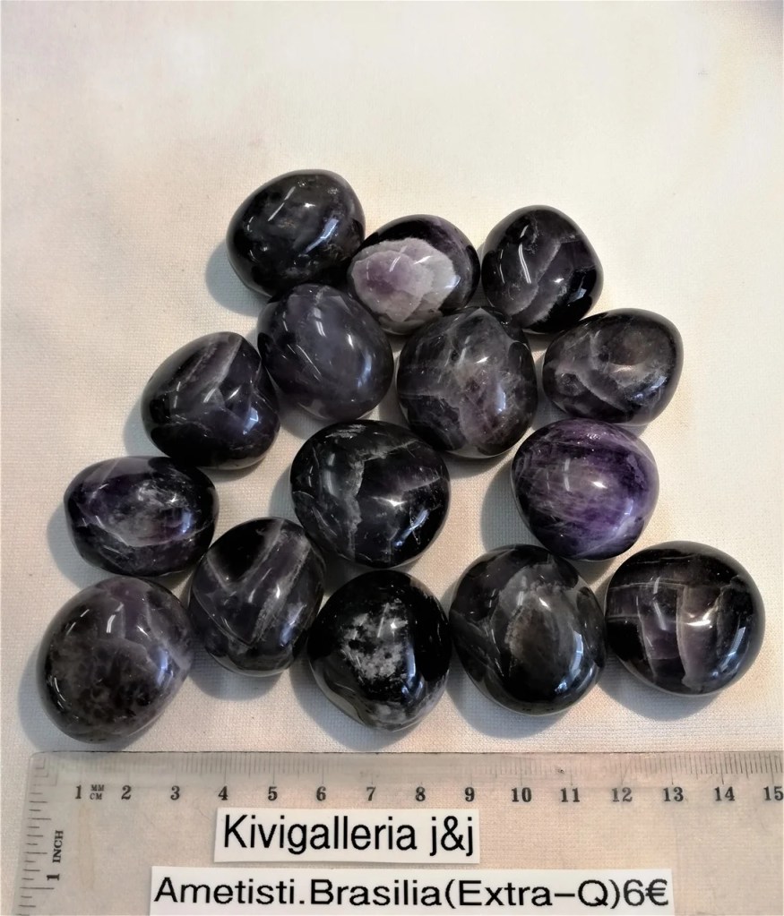 Upeita EQ-laatuisia rumpuhiottuja Ametisteja. Koko n. 2,5-3,5cm. Väri vaihtelee vaaleasta laventelista tummaan purppuraan ja kirkkaus vaihtelee lähes täysin läpinäkyvästä vain aavistuksen läpikuultavaan. Chakra: Kruunuchakra Ametisti rauhoittaa ja puhdistaa, se vaikuttaa myönteisesti temperamenttiin ja auttaa irtautumaan riippuvuuksista sekä pakonomaisista käyttäytymismalleista. Ametisti edistää siveyttä ja puhtautta, se tyynnyttää vihan tunteita ja hillitsee liiallisia intohimoja. Kivi vahvistaa auraa, tarjoaa suojaa ja lisää itseluottamusta. Ametisti myös lievittää surua, hermostuneisuutta, jännitystä ja taipumusta yliherkkyyteen.
