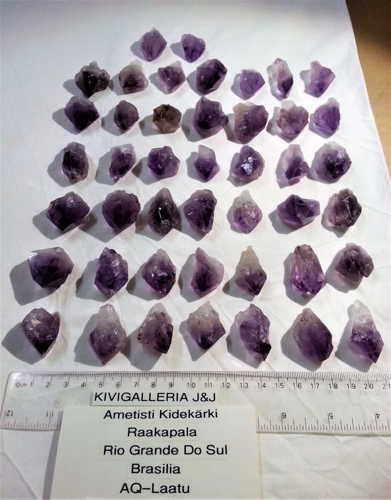Erinomaista AQ-laatua olevia, käsittelemättömiä Ametisti kidekärkiä Brasiliasta. Kiteen pituus n. 2,5-3cm. Kruunuchakran kivi. Fengshuin opit suosittelevat asettamaan ametistin tietokoneen tai television läheisyyteen sähkömagneettisen säteilyn vaikutusten vähentämiseksi. Jalokiviterapiassa ametistia käytetään hermoston vaivojen kuten päänsäryn ja riippuvuuksien hoitoon. Rauhoittava ja suojeleva kivi, rentouttaa kehoa ja poistaa kipuja. Hyvä tasoittaja. Yksi suosituimmista jalokivistä. Mainio voimakivi Jousimiehelle, Kauriille ja Vesimiehelle.