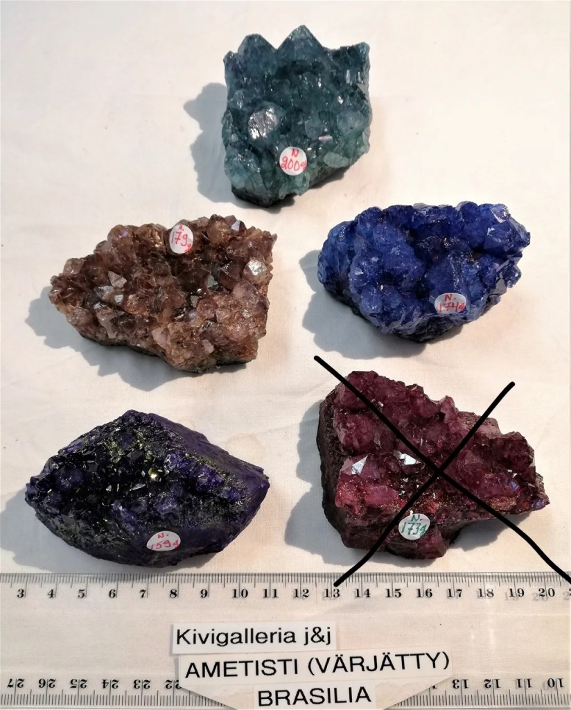 Ametisti kidepaloja, värjättyjä -kuin karkkeja, paino n.159-200g. Ametisti on paloina ja kiteinä esiintyvä kvartsin muoto. Perinteinen violetti väri syntyy mangaani- ja rautasulkeumista. CHAKRA: Kruunuchakra Ametistin sanotaan tyynnyttävän vihan tunteita ja hillitsevän liiallisia intohimoja. Kivi vahvistaa auraa, tarjoaa suojaa ja lisää myös itseluottamusta.