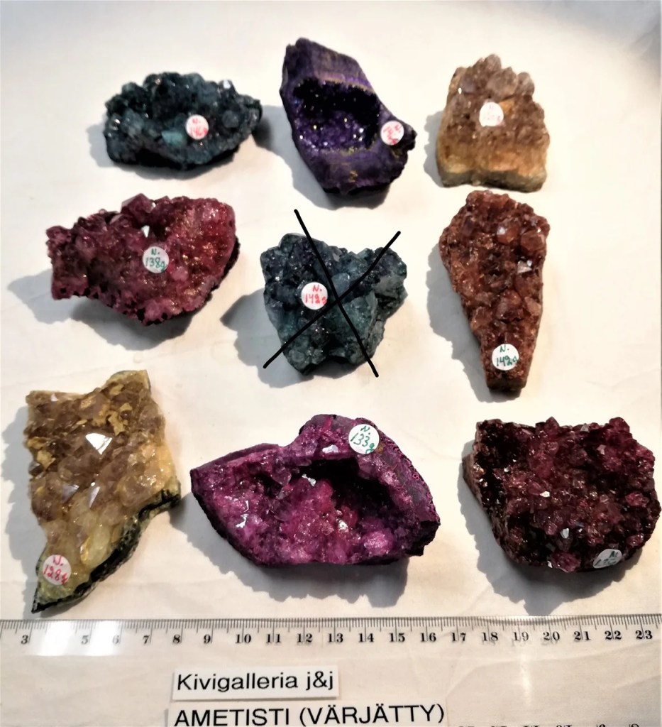 Ametisti kidepaloja, värjättyjä -kuin karkkeja, paino n.128-150g. Ametisti on paloina ja kiteinä esiintyvä kvartsin muoto. Perinteinen violetti väri syntyy mangaani- ja rautasulkeumista. CHAKRA: Kruunuchakra Ametistin sanotaan tyynnyttävän vihan tunteita ja hillitsevän liiallisia intohimoja. Kivi vahvistaa auraa, tarjoaa suojaa ja lisää myös itseluottamusta.