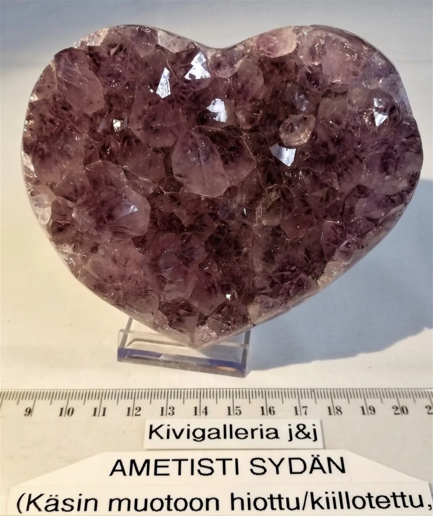Ametisti kidepalasta käsin hiottu upea sydän. AQ+-laatua, koko n.4,5 x 8,5 x 10cm ja paino 600g. Ametistin väri vaihtelee vaaleasta laventelista tummaan purppuraan ja kirkkaus vaihtelee lähes täysin läpinäkyvästä vain aavistuksen läpikuultavaan. CHAKRA: Kruunuchakra Ametistin uskotaan rauhoittavan ja puhdistavan, vaikuttavan myönteisesti temperamenttiin ja auttavan irtautumaan riippuvuuksista sekä pakonomaisista käyttäytymismalleista. Ametisti edistää siveyttä ja puhtautta, se tyynnyttää vihan tunteita ja hillitsee liiallisia intohimoja. Kivi vahvistaa auraa, tarjoaa suojaa ja lisää itseluottamusta. Ametistin sanotaan myös lievittävän surua, hermostuneisuutta, jännitystä ja taipumusta yliherkkyyteen.