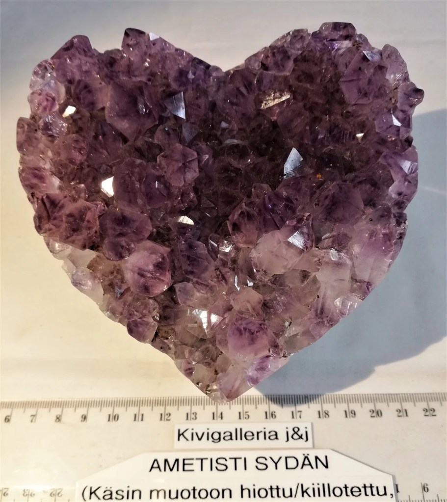 Upea käsityönä muotoon hiottu/kiillotettu,osittain kristallisoitunut Ametisti kidepala sydän. Nro.5./n.850g/6x12x12cm.