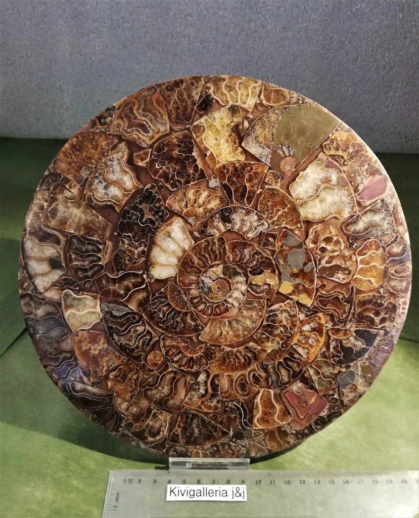Hieno Cleoniceras Ammoniiteista tehty pyöreä laatta. Ammoniitit on upotettu epoksiin ja ne näkyvät myös ns. nurjalta puolelta. Hieno vaikka seinälle ripustettuna.Keskimmäisessä kuvassa on valo takana. Levyn koko n.0,8 x 25cm, paino 925g. Ammoniittia pidetään suojelevana, varmana ja rentouttavana kivettymänä. Sitä suositellaan arkkitehdeille ja muille rakentamisen kanssa tekemisissä oleville. Fengshui taasen ehdottaa käyttämään ammoniittia onnekkaan energiakentän takaamiseksi.