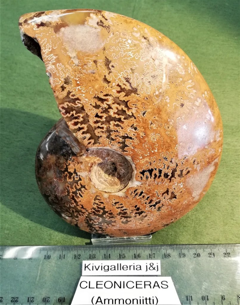 Ammoniitti Cleoniceras, hiottu/kiillotettu. Koko n.3,4 x 11,7 x 14,6cm ja paino n.497g. Nämä värikkäimmät ammoniitit tulevat Madagaskarilta Afrikan rannikolta. Cleoniceras on yleisin tyyppi Madagaskarilla. 99% Madagaskarilta löydetyistä ammoniiteista on tätä lajia, jolla on sileä kuori ja kulmikas segmentti. Chakra: Juurichakra Jalokiviterapiassa ammoniittia pidetään suojelevana, varmana ja rentouttavana kivettymänä. Ammoniittia suositellaan arkkitehdeille ja muille rakentamisen kanssa tekemisissä oleville. Fengshui taasen ehdottaa käyttämään ammoniittia onnekkaan energiakentän takaamiseksi.