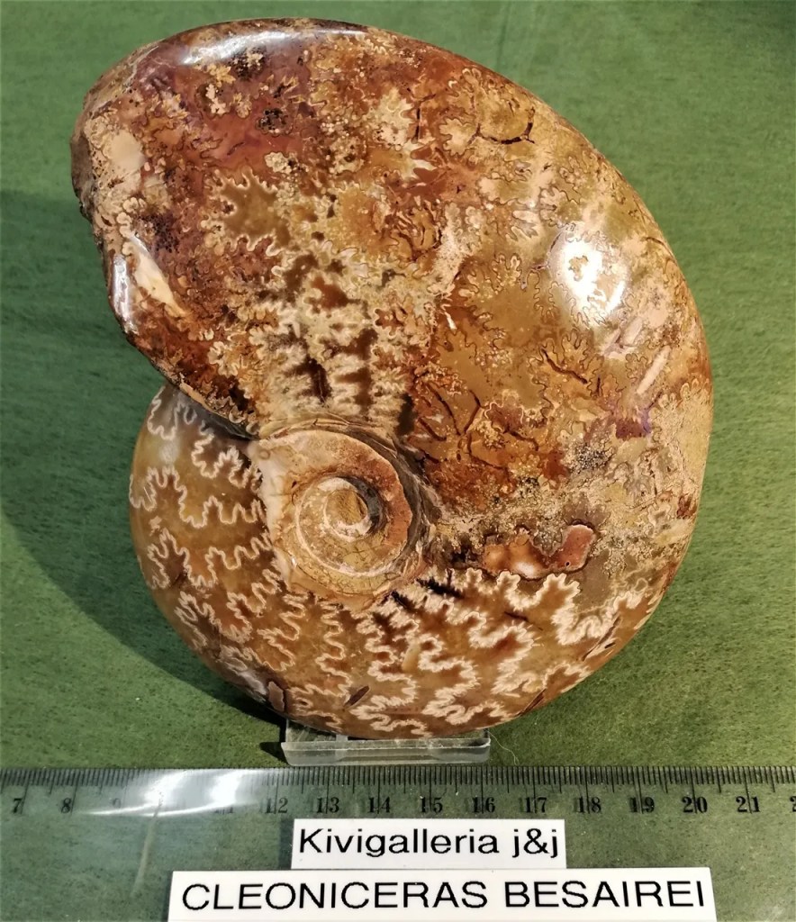A/EQ-laatuinen upea Cleoniceras Besairei. Koko n.35,5 x 11 x 12,9cm, paino n.534g. Nämä värikkäimmät ammoniitit tulevat Madagaskarilta Afrikan rannikolta. Cleoniceras on yleisin tyyppi Madagaskarilla. 99% Madagaskarilta löydetyistä ammoniiteista on tätä lajia, jolla on sileä kuori ja kulmikas segmentti. Chakra: Juurichakra Jalokiviterapiassa ammoniittia pidetään suojelevana, varmana ja rentouttavana kivettymänä. Ammoniittia suositellaan arkkitehdeille ja muille rakentamisen kanssa tekemisissä oleville. Fengshui taasen ehdottaa käyttämään ammoniittia onnekkaan energiakentän takaamiseksi.