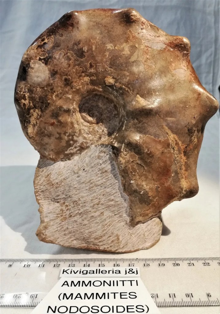 Upea Ammoniitti Mammites Nodosoides, puhdistettu taitavasti esiin emäkivestä. Koko n.9 x 14 x 16cm ja paino 2.180kg. Tämän lajin ammoniitit elivät Liitukaudella n. 99,6 – 66,5 milj.v. sitten. Ammoniitit olivat nilviäisten pääjaksoon ja siinä pääjalkaisten luokkaan kuuluvia fossiilisia merieläimiä, joilla oli spiraalimainen hieman pässinsarvea muistuttava kuori. Ammoniitit ilmestyivät noin 400 miljoonaa vuotta sitten siluuri- ja devonikausien vaihteessa ja hävisivät sukupuuttoon liitukauden lopun joukkotuhossa 65 miljoonaa vuotta sitten. Ammoniitti kasvatti kuoren ympärilleen. Eläimen kasvaessa ja kuorikammion käydessä ahtaaksi se kasvatti seuraavan suuremman kammion, joten ammoniittien kuori lopulta muodostui sarjasta suurenevia kammioita, joista viimeisimmässä ja suurimmassa oli itse eläin. Ammoniitti sääteli uimasyvyyttään lisäämällä tai vähentämällä veden määrää tyhjissä kammioissa. Ne olivat myös lihansyöjiä.