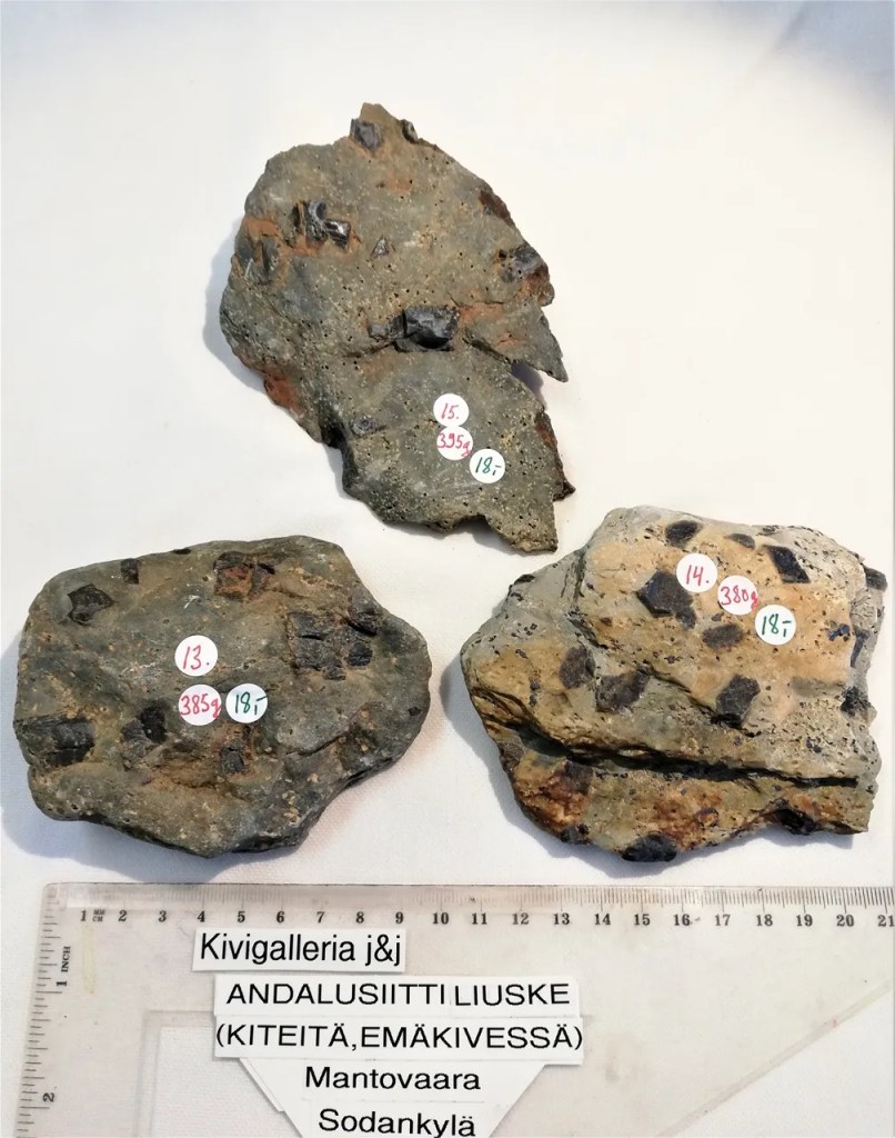 Numeroidut palat Mantovaaran Andalusiitti liuskekiveä, painot nro.13; 385g, nro.14; 380g ja nro.15; 395g. Läpinäkymätön, himmeän lasikiiltoinen Andalusiitti on yksi kolmesta alumiinisilikaatin muodosta. Sillä on täsmälleen sama kemiallinen koostumus kuin sillimaniitilla ja kyaniitilla. Kidejärjestelmältään se on rombinen. Andalusiitti stimuloi menneitä muistoja sekä vapauttaa emotionaalisia tukoksia. Sanotaan, että se myös auttaa keskittymisessä. Fyysisellä tasolla kivi yhdistetään mm. silmiin. Sopii kaikille Chakroille.