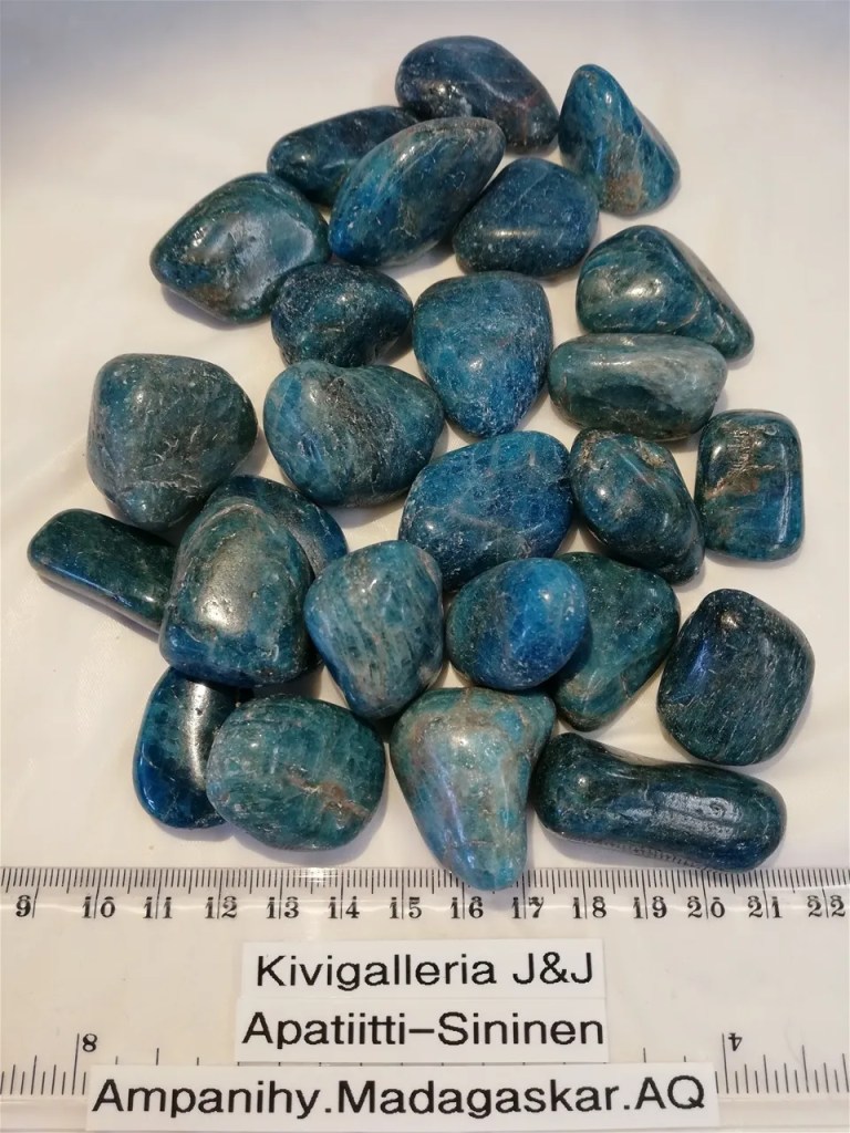 Uusi erä!!,upean sinisiä,AQ-laatuisia Apatiitteja. Koko n.2-3×3-4cm. Apatiitti on läpinäkyvä tai läpinäkymätön, kalsiumfosfaattia oleva hauras heksagoninen kide. Nimi on peräisin kreikankielen sanasta ’apatao’ (johtaa harhaan), sillä kiteen monet eri värisävyt sekoittavat sen herkästi muihin jalokiviin. Motivaatiota ja inspiraatiota kasvattava apatiitti on hyvä kivi kommunikaatioon. Chakra; Kurkkuchakra, Sydänchakra Apatiitti on erittäin fyysinen kivi. Fyysisellä tasolla apatiitin sanotaan myös parantavan luustoa ja rohkaisevan uusien solujen muodostumista. Sininen apatiitti on yksi horoskooppimerkki Kaksosten onnenkivistä. Se liitetään planeetoista myös Jupiteriin tai Merkuriukseen lähteestä riippuen.