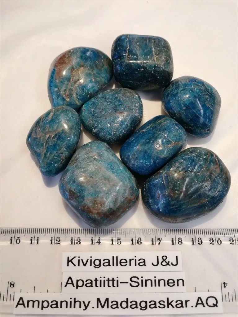 Uusi erä!!,upean sinisiä,AQ-laatuisia Apatiitteja. Koko n.3-3.5×3.5-4.5cm. Apatiitti on läpinäkyvä tai läpinäkymätön, kalsiumfosfaattia oleva hauras heksagoninen kide. Nimi on peräisin kreikankielen sanasta ’apatao’ (johtaa harhaan), sillä kiteen monet eri värisävyt sekoittavat sen herkästi muihin jalokiviin. Motivaatiota ja inspiraatiota kasvattava apatiitti on hyvä kivi kommunikaatioon. Chakra; Kurkkuchakra, Sydänchakra Apatiitti on erittäin fyysinen kivi. Fyysisellä tasolla apatiitin sanotaan myös parantavan luustoa ja rohkaisevan uusien solujen muodostumista. Sininen apatiitti on yksi horoskooppimerkki Kaksosten onnenkivistä. Se liitetään planeetoista myös Jupiteriin tai Merkuriukseen lähteestä riippuen.