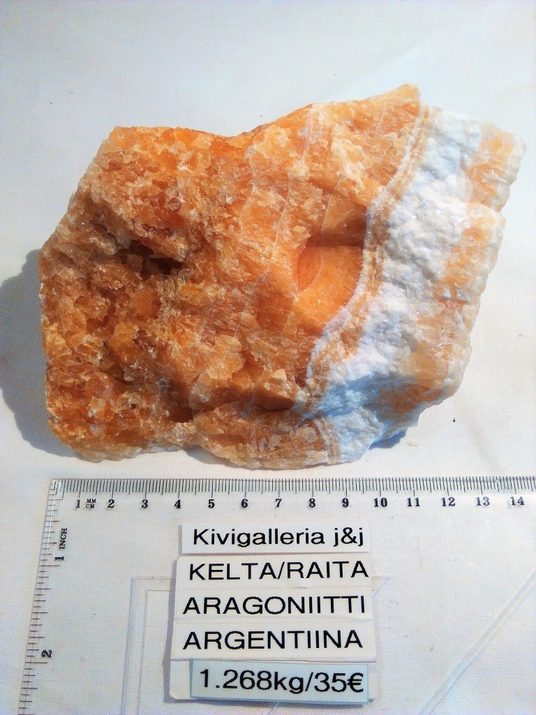 1.268g painava hieno raakapala Aragoniittia. Lasikiiltoinen, läpinäkyvä tai -näkymätön ja hauras kalsiumkarbonaatti, joka on nimetty espanjalaisen Aragon maakunnan mukaan vuonna 1790. Esiintyy rako- tai ontelotäytteenä esimerkiksi sputnikin, viuhkan tai korallin muotoisena. Aragoniitti poistaa stressiä sekä on rauhoittava ja itsekuriin auttava kivi joka sallii syvän ymmärryksen. Se on hyvin maadoittava kivi. Aragoniitti on mainio kivilahja nuorille, jotka ovat kohtaamassa ensimmäisiä haasteitaan elämässä.