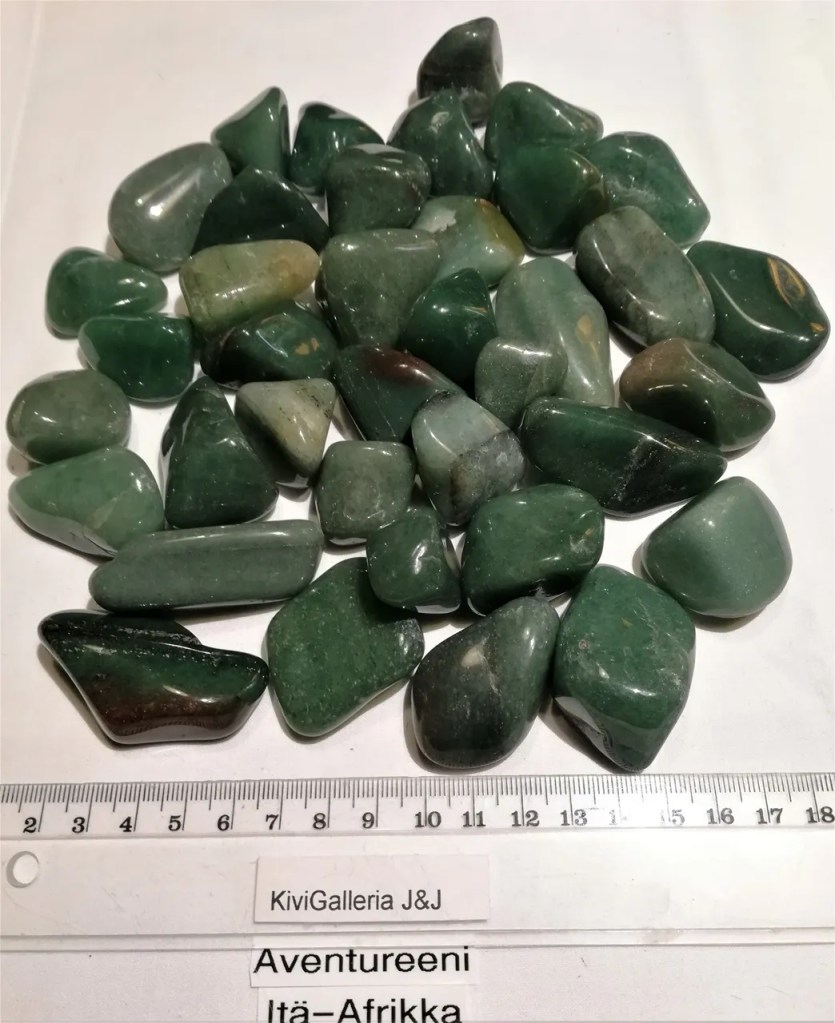 AQ-laatuisia rumpuhiottuja Aventureeneja Itä-Afrikasta. Koko n. 2-3 x 2,5-5cm. Chakra: Sydänchakra Aventuriini on yleisrauhoittava ja parantava kivi, joka antaa kantajalleen omanarvontunnetta ja uskoa itseensä. Vihreä aventuriini on myös yksi Ravun, Neitsyen ja Vaa’an horoskooppikivistä. Sen uskotaan auttavan ammatinvaihdossa ja tuovan tullessaan hyvinvointia sekä tunteellista tasapainoa. Muinoin vihreän aventuriinin uskottiin kutsuvan Onnetarta erityisesti raha-asioiden suhteen eli tämä kivi on suositeltava voimakivi esimerkiksi kasinolla kävijälle.