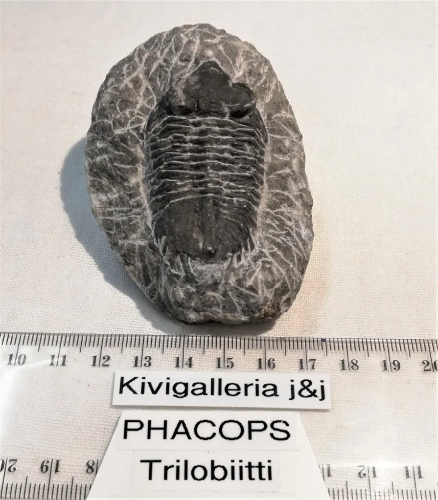 Phacops Coltraneia Oufatenensis. 409-392 milj.vuotta.Devonikausi. Ofaten-vuori, Marokko Trilobiittifossiili on kaiverrettu esiin kalkkikivestä, emäkiven koko n.3,5 x 5,5 x 7,5cm ja Trilobiitti on n.3 x 5cm, kokonaispaino 180g.