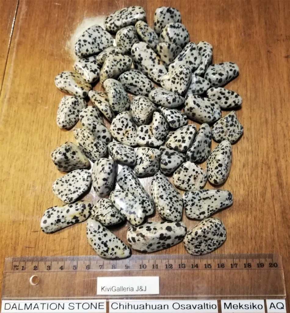 Rumpuhiottu Dalmation Stone. Koko n.2-2,5cm x 2,5-4,5cm. Monimuotoinen, -kuvioinen ja -värinen kivilaji, jonka nimi tulee kreikankielen täplikästä kiveä tarkoittavasta sanasta. Sitä pidetään kielteisyyttä torjuvana kivenä, joka auttaa myös keskittymään ja viemään asiat päätökseen. Sen uskotaan auttavan luomaan yhteyden luontoon ja maahan. Fyysisellä tasolla kiven on uskottu auttavan mm. rentouttamaan lihaksia, laukaisemaan kramppeja ja ylipäätään toimivan voimakkaana fyysisenä parantajana.