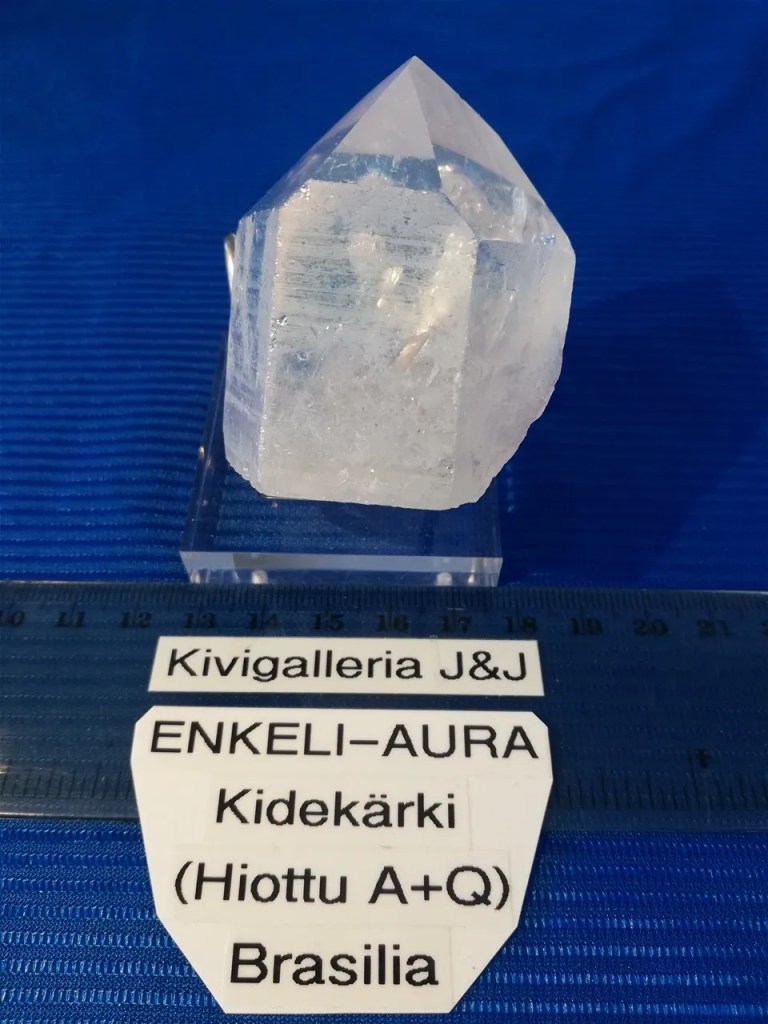 Enkeli-Aura-kirkas kivartsi,johon on lisätty kuumentamalla/höyryttämällä platinaa ja hopeaa.Enkeli-Auralla on kyky laajentaa tietoisuutta ja parantaa fyysistä ja henkistä kehoa poikkeuksellisen korkealla värähtelyllä.Enkeli-Auran energia on erittäin rakastavaa,ja se stimuloi henkeä kohottaen mielialaa.Meditointi tällä kristallilla auttaa saavuttamaan seesteyden ja rauhan ,puhdistuksen ja levon,sekä mennä ruumiin ulkopuolelle tuntemaan ja saamaan avun enkelien oppailta.Kivi auttaa myös muistamaan aiempien inkarnaatioiden oppitunteja ja mukauttamaan oman hengellisen tarkoituksen.Enkeli-Auraa voidaan käyttää kaikkien chakrojen kohdistamiseen ja puhdistamiseen,täten Enkeli-Aura on täydellinen parantaja,jonka uskotaan yhdistävän energiakentän fyysisen ruumiin kanssa.Enkeli-Aura on myös oiva ennustuskide,antaen välähdyksen tulevaisuudestasi.Enkeli-Auran sanotaan olevan hyödyllinen yleiselle terveydelle palauttaen fyysisen ja henkisen elinvoimasi,vapauttaen ei-toivottuja negatiivisia energioita,kohottaen mielialaasi,vahvistaen immuunijärjestelmääsi ja on myös hyvä ummetus/ruuansulatus häiriöihin.Ja jos olet altis ahdistukselle,tai paniikkikohtauksille,tai jos sinulla on fobia jostakin,niin Enkeli-Auraa on hyvä pitää mukanasi.Enkeli-Aura on myös tehokas kristalli palovammoisssa ja käytetään myös hyvin useasti vyöhyketerapiassa ja reikihoidossa.