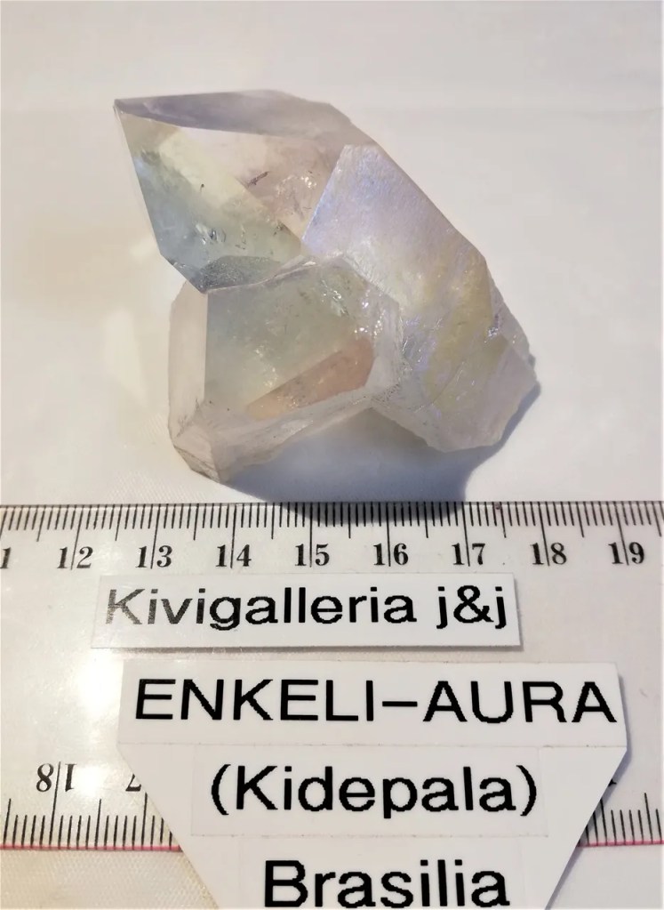 Enkeli Aura – Angel Aura Quartz – Kirkas kvartsi johon on lisätty platinaa ja hopeaa kuumentamalla/höyryttämällä, joskus kultaa tai muita hivenmetalleja. Väreinä vaaleansininen, sateenkaaren ja hopean sävy. Koko n.3,5 x 5 x 6,5cm ja paino 108g. Kristallilla on kyky laajentaa tietoisuutta ja parantaa fyysistä ja henkistä kehoa poikkeuksellisen korkealla värähtelyllä. Energia on erittäin rakastavaa, se stimuloi henkeä ja kohottaa mielialaa. Meditointi tällä kristallilla auttaa saavuttamaan seesteisyyden ja rauhan, puhdistuksen ja levon, sekä mennä ruumiin ulkopuolelle tuntemaan ja saamaan avun enkelien oppailta. Kivi auttaa muistamaan aiempien inkarnaatioiden oppitunteja ja mukauttamaan oman hengellisen tarkoituksensa. Sitä voidaan myös käyttää kaikkien chakrojen kohdistamiseen ja puhdistamiseen.