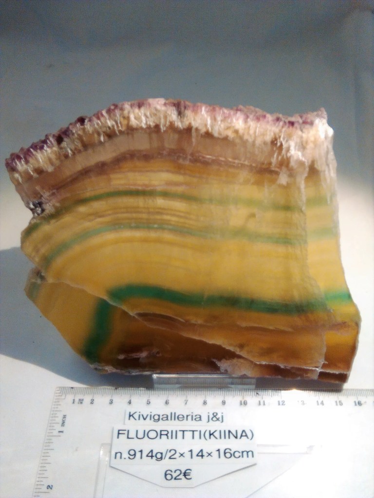 Upea Fluoriittilevy. Hiottu toiselta puolelta, koko n. 2x14x16cm ja paino 914g. Fluoriitti on tehokas ympäristön kielteisten energioiden sulattaja, lisäksi se on hyvä kivi auran ja chakrojen puhdistamiseen. Fluoriitti rauhoittaa sekalaista olotilaa. Fluoriitti on eräs Vaa´an, Kalojen ja Vesimiehen onnenkivistä. Fluoriitti stimuloi kolmatta silmää ja se onkin hyvä meditaatiokivi, sen sanotaan kohottavan mystisiä näkyjä. Toimii hyvin sähkömagneettisen säteilyn torjumisessa eli suositellaan kiven pitämistä esim. tietokoneen läheisyydessä.