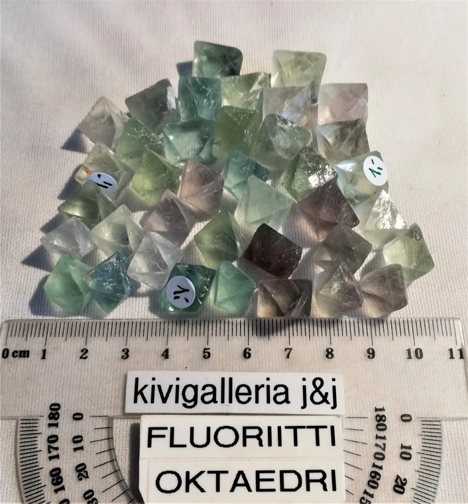 Luonnollinen Fluoriitti oktaedri kide, AQ-laatua. Koko n.1-1,3 x 1,5-1,7cm. Fluoriitti on tehokas ympäristön kielteisten energioiden sulattaja, lisäksi se on hyvä kivi auran ja chakrojen puhdistamiseen. Fluoriitti stimuloi kolmatta silmää ja se onkin hyvä meditaatiokivi, sen sanotaan kohottavan mystisiä näkyjä. Toimii hyvin sähkömagneettisen säteilyn torjumisessa eli suositellaan kiven pitämistä esim. tietokoneen läheisyydessä.