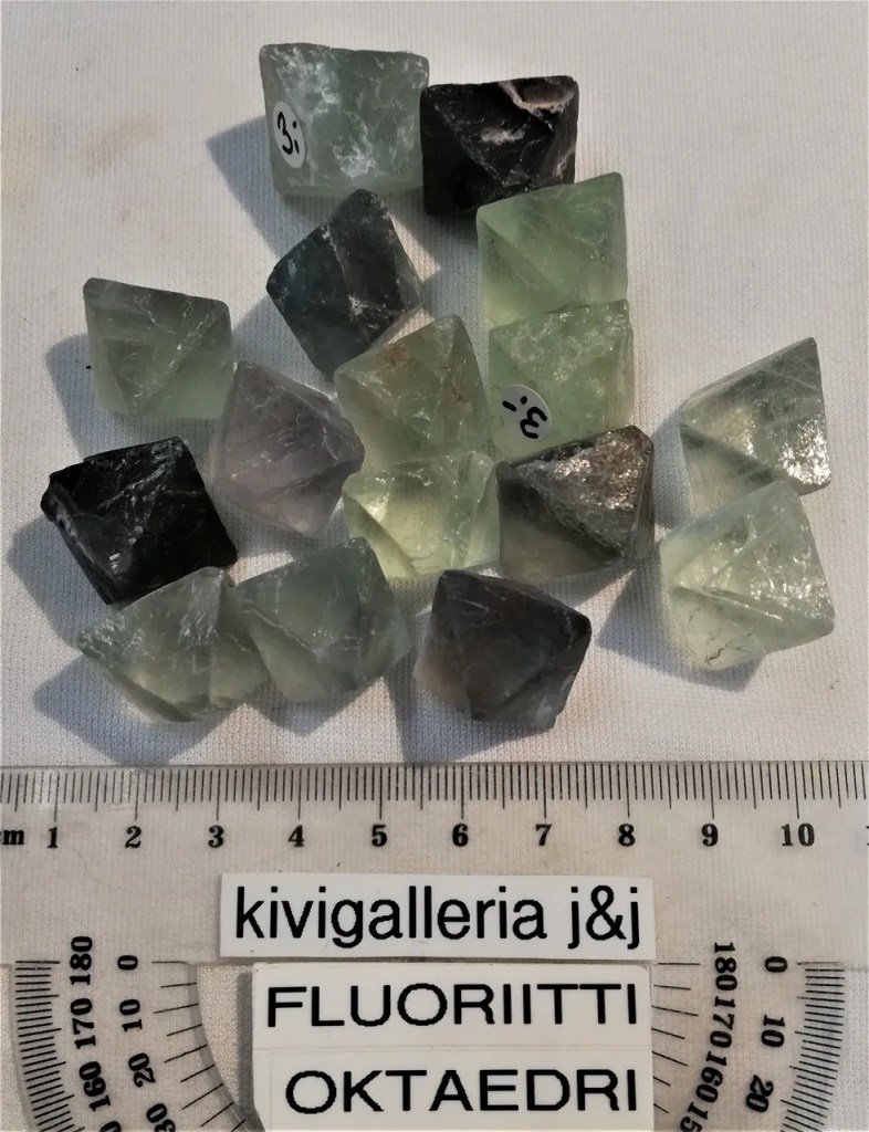 Luonnollinen Fluoriitti oktaedri kide, AQ-laatua. Koko n.1,8-2 x 2,5-2,8cm. Fluoriitti on tehokas ympäristön kielteisten energioiden sulattaja, lisäksi se on hyvä kivi auran ja chakrojen puhdistamiseen. Fluoriitti stimuloi kolmatta silmää ja se onkin hyvä meditaatiokivi, sen sanotaan kohottavan mystisiä näkyjä. Toimii hyvin sähkömagneettisen säteilyn torjumisessa eli suositellaan kiven pitämistä esim. tietokoneen läheisyydessä.