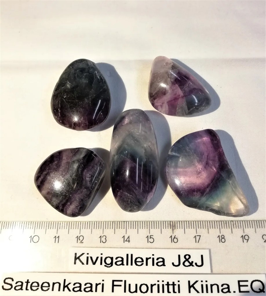 Rumpuhiottuja EQ-laatuisia Sateenkaarifluoriitteja. Koko n.2-3cm x 3,5-5cm. Uskotaan, että Fluoriitti on tehokas ympäristön kielteisten energioiden sulattaja, lisäksi uskotaan sen olevan hyvä kivi auran ja chakrojen puhdistamiseen. Fluoriitti stimuloi kolmatta silmää ja se onkin hyvä meditaatiokivi, sen sanotaan kohottavan mystisiä näkyjä. Toimii hyvin sähkömagneettisen säteilyn torjumisessa eli suositellaan kiven pitämistä esim. tietokoneen läheisyydessä. Fluoriitti on eräs Vaa´an, Kalojen ja Vesimiehen onnenkivistä. Chakra: Otsachakra