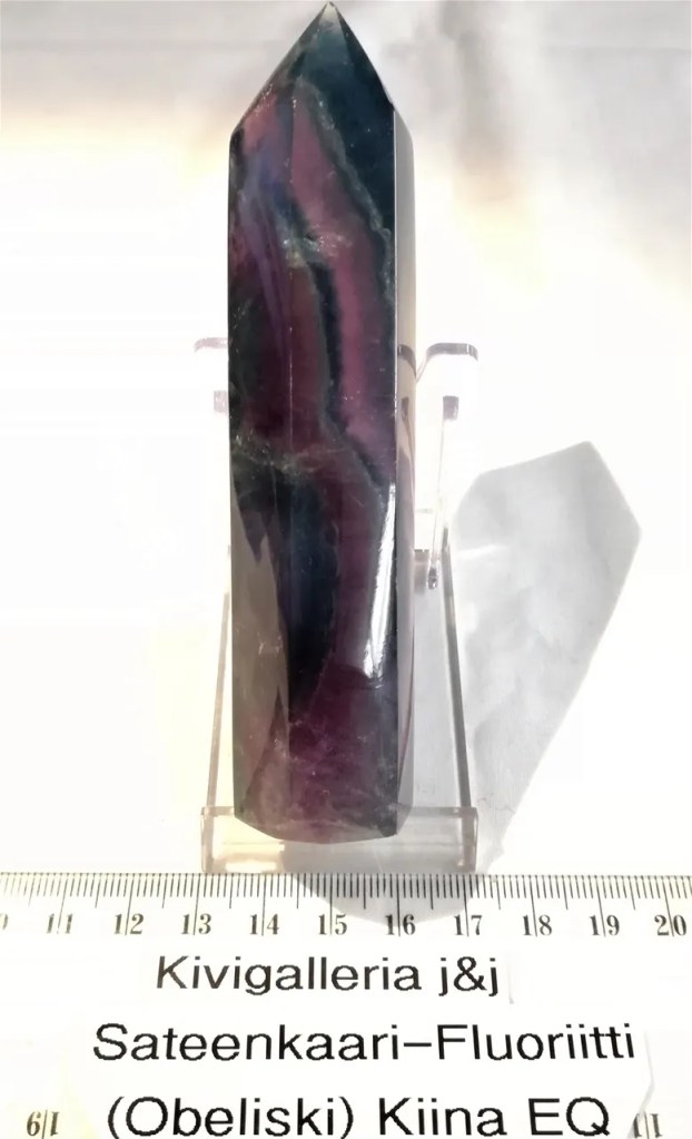 Hieno, EQ-laatuinen Sateenkaari fluoriitista hiottu Obeliski. Koko n.2,6 x 11cm ja paino 144g. Kivi on ihanteellinen hoitokivi fyysisen hyökkäyksen tai trauman vaikutuksiin jotka varjostavat elämään. Se on sisäisen viisauden kivi, joka vahvistaa ja tukee intuitiota, tuo tietoisuuteen puhdistavia ja nerokkaita ajatuksia sekä ideoita. Kivi tukee sisäisessä kasvussa ja puhdistaa mieltä ja auraa epäpuhtauksista ja suojaa kielteisiltä värähtelyiltä. CHAKRA: Kolmas silmä/Otsachakra