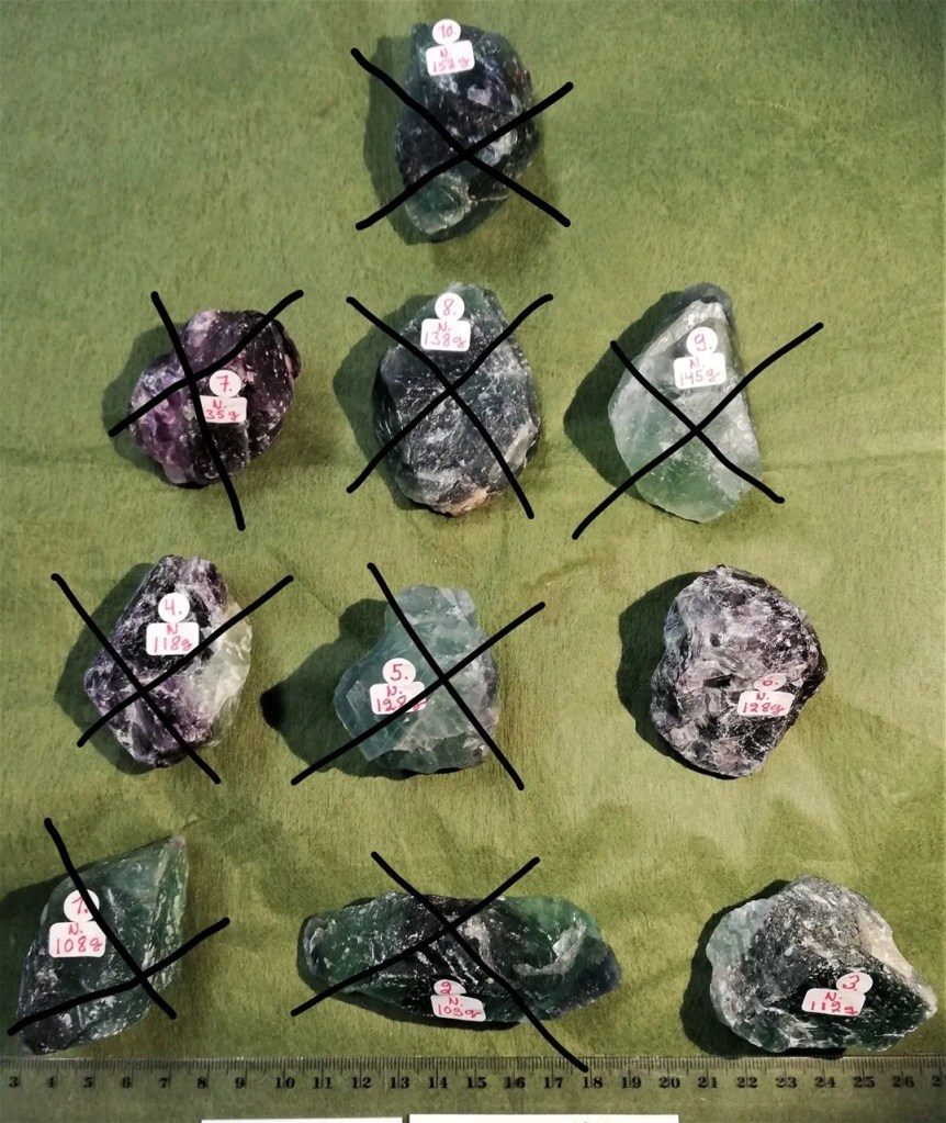 Sateenkaari/Vihreä fluoriitti raakapalat, erinomaista EQ/AQ-laatua. Palan paino n. 108g-152g. Fluoriitti stimuloi kolmatta silmää ja se onkin hyvä meditaatiokivi, sen sanotaan kohottavan mystisiä näkyjä. Toimii hyvin sähkömagneettisen säteilyn torjumisessa eli suositellaan kiven pitämistä esim. tietokoneen läheisyydessä. Fluoriitti on tehokas ympäristön kielteisten energioiden sulattaja, lisäksi se on hyvä kivi auran ja chakrojen puhdistamiseen. Fluoriitti on eräs Vaa´an, Kalojen ja Vesimiehen onnenkivistä.