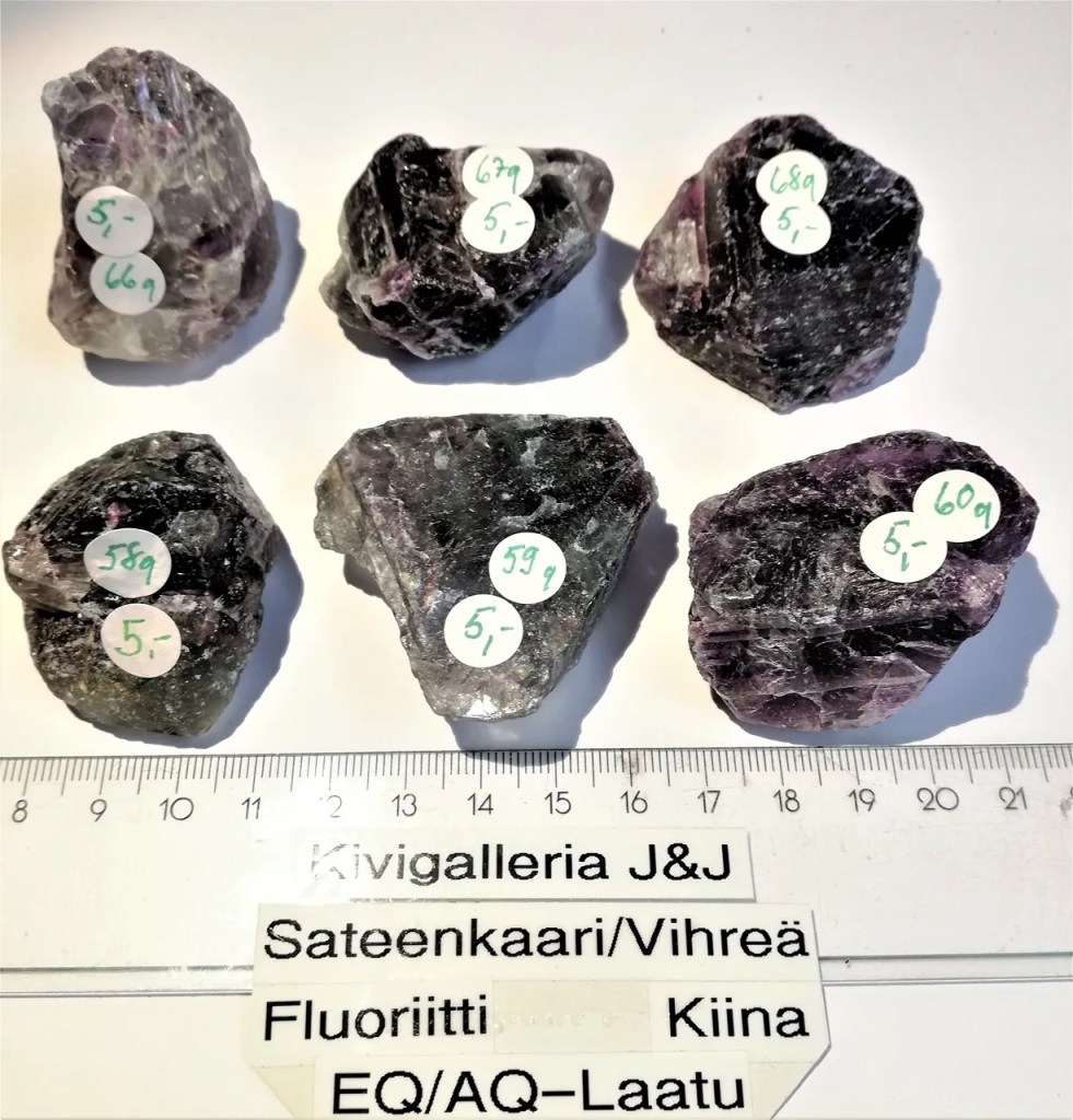 Sateenkaari/Vihreä fluoriitti raakapalat, erinomaista EQ/AQ-laatua. Palan paino n.58-68g ja koko n.4,5-5cm x 4,5-5cm. Fluoriitti stimuloi kolmatta silmää ja se onkin hyvä meditaatiokivi, sen sanotaan kohottavan mystisiä näkyjä. Toimii hyvin sähkömagneettisen säteilyn torjumisessa eli suositellaan kiven pitämistä esim. tietokoneen läheisyydessä. Fluoriitti on tehokas ympäristön kielteisten energioiden sulattaja, lisäksi se on hyvä kivi auran ja chakrojen puhdistamiseen. Fluoriitti on eräs Vaa´an, Kalojen ja Vesimiehen onnenkivistä.