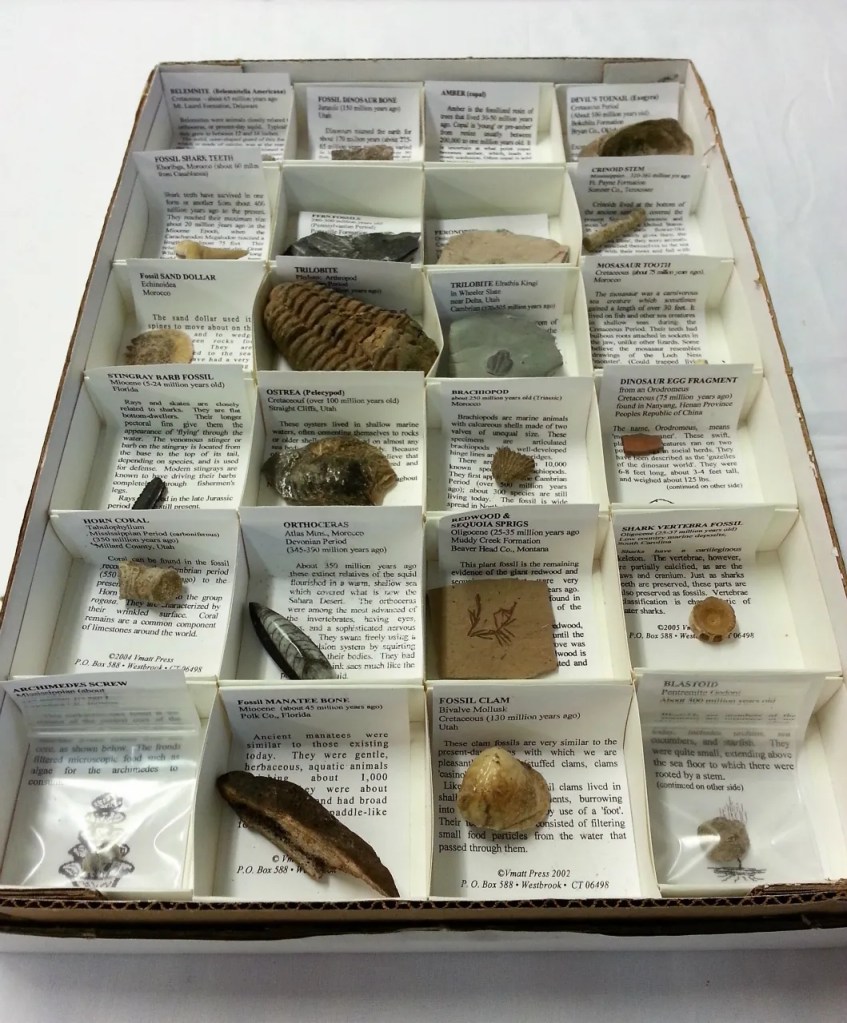 Hieno kokoelma fossiileja (24kpl.). Jokaisessa mukana infoteksti (engl.) mm. löytöpaikasta ja aikakaudesta jolloin ko. eliö/kasvi on elänyt/kasvanut maan päällä.