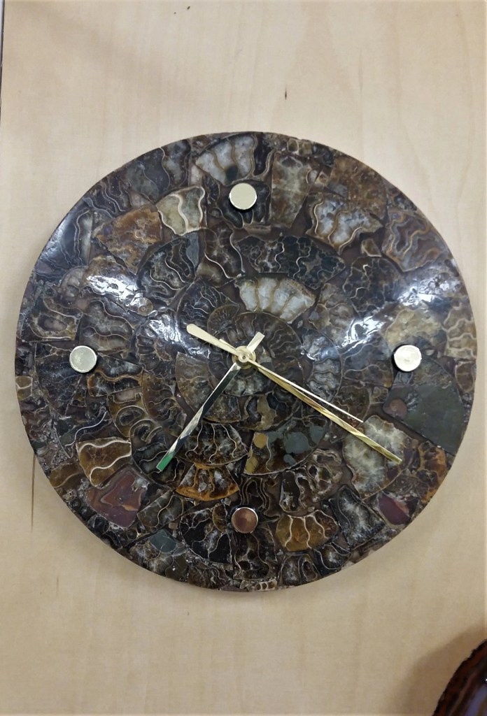 Kellon pohjana upea Cleoniceras Ammoniiteista tehty laatta, jossa ammoniitit on upotettu epoksiin. Koko n. 0,8 x 25cm ja paino 925g. Tyylikäs ja selkeä kellotaulu. Ammoniittia pidetään suojelevana, varmana ja rentouttavana kivettymänä. Sitä suositellaan arkkitehdeille ja muille rakentamisen kanssa tekemisissä oleville. Fengshui taasen ehdottaa käyttämään ammoniittia onnekkaan energiakentän takaamiseksi.