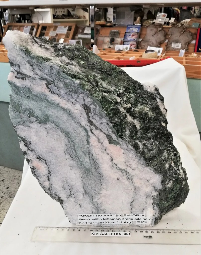 Hieno Fuksiitti (kvartsi) pala, koko n.11×24-26×33cm ja paino 12.4kg (2 saha pintaa ja yksi porakangen jälki). Harvinainen smaragdinvihreä muskoviitin kiilteinen ja kromipitoinen johdannainen. Fuksiitti on uudistumisen ja uusiutumisen kivi, joka ylläpitää yleistä hyvinvointia. Se auttaa organisoimaan asioita tiettyjen aikataulujen puitteissa ja lisää joustavuutta kaikilla tasoilla. Kivi sopii erinomaisesti puutarhureille sillä se kohottaa ilon tunteita luonnon kauneudesta ja omaa läheiset yhteydet deevoihin (luonnonhenki, elementti tuli, vesi, maa tai ilma). Chakra: Sydän- ja Kruunuchakra