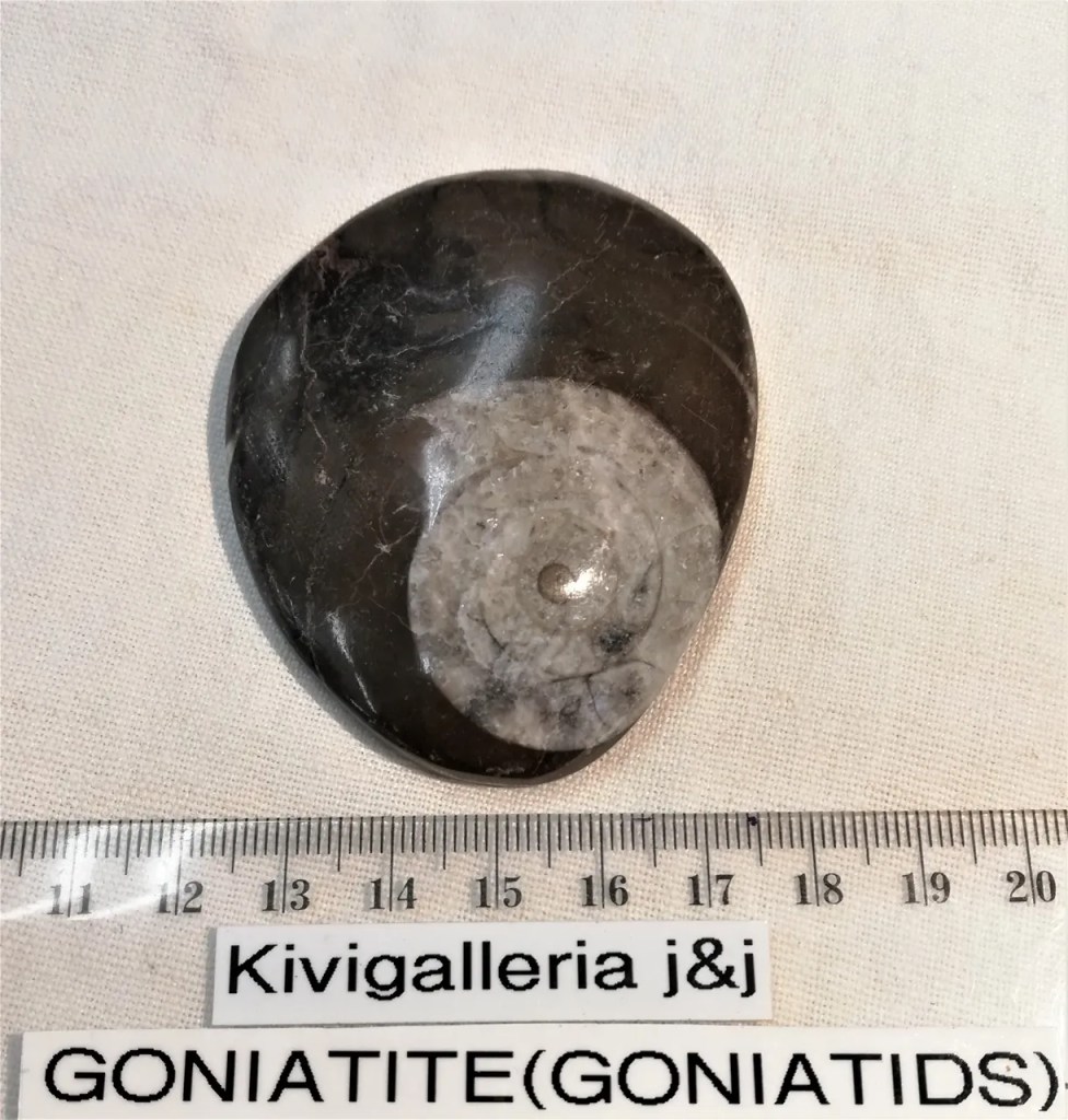Goniatite-fossiili, koko n.1,5 x 5,5 x 7cm ja paino n.68g. Toiselta puolen hiottu ja kiilloitettu, toinen puoli luonnollinen. Goniatite/Goniatids on n.390 milj.v. sitten Keski-Devonikaudelta Permikaudelle elänyt, Ammoniitin alaluokkaan kuuluva fossiili. Kaikilla Goniatiiteilla oli ulkoinen kuori, joka jakautui sisäisesti kammioksi, joista viimeisimmässä (ja suurimmassa) eläin eli. Se kasvatti aina suuremman kuorikammion kasvaessaan. Kelluvuutta se pystyi säätelemään onttojen kammioiden sisältämän veden avulla. Kuoren etuosassa oleva avoin kammio tarjosi elintilaa ja pääsyn avoimeen veteen. Goniatiittien yleinen morfologia ja tapa oli todennäköisesti samanlainen kuin niiden myöhempien sukulaistensa, Ammoniittien. Ne olivat vapaasti uivia ja niillä oli pää jossa oli kaksi hyvin kehittynyttä silmää ja lonkeroita.