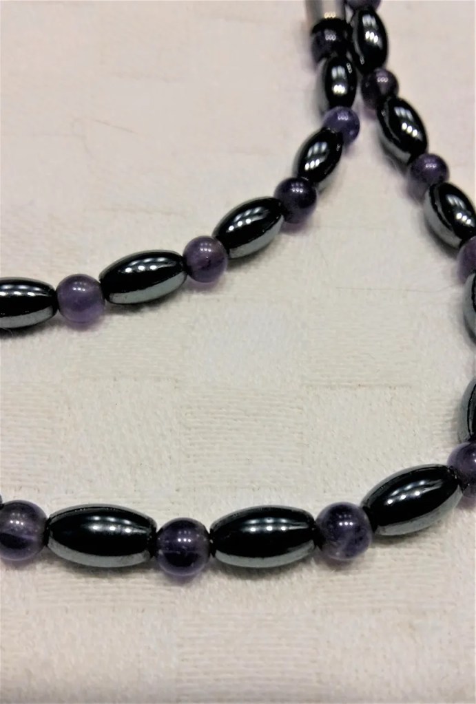 Upea kaulakoru Ametistihelmistä (4mm) ja Hematiitti ovaalihelmistä (8mm), pituus n. 40cm. Napakka magneettilukko. Ametisti: Ametisti rohkaisee sisäiseen rauhaan, taistelee riippuvuuksia vastaan, kuljettaa energiaa ja omaa korkean henkisen värähtelyn -hyvä meditaatioivi. Kruunuchakran kivi. Hematiitti: Hematiitin sanotaan olevan maadoittava kivi ja auttavan pääsemään stressistä ja masennuksesta, sitä suositellaan myös unettomuuteen. Hematiitti vahvistaa keskittymistä ja poistaa itse asetettuja rajoituksia ja omaa myös vahvan yang-elementin. Juurichakran kivi.