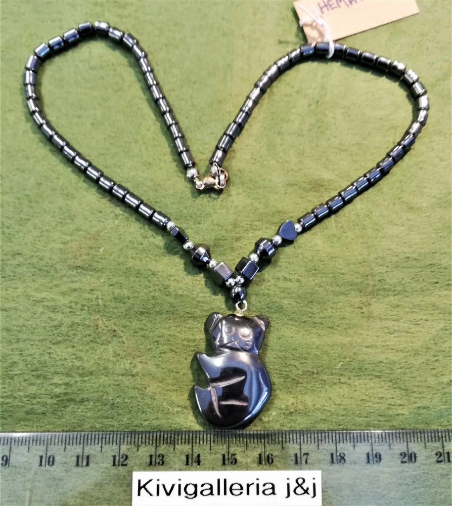 Suloinen Hematiitti kaulakoru Koala-karhu riipuksella. Pituus n.39cm, papukaijalukko nikkelitöntä korumetallia. Sana hematiitti on johdettu kreikan sanasta hemos, joka tarkoittaa verta. Hematiitin perusväri on teräksenharmaa, mutta rapautuessaan se muuttuu verenpunaiseksi. Hematiitin sanotaan olevan maadoittava kivi ja auttavan pääsemään stressistä ja masennuksesta, sitä suositellaan myös unettomuuteen. Hematiitti vahvistaa keskittymistä ja poistaa itse asetettuja rajoituksia ja omaa myös vahvan yang-elementin. Fyysisellä tasolla hematiitti liitetään muun muassa jalkoihin, erityisesti suonenvedosta kärsiviä suositellaan laittamaan Hematiitti esim. sukkaan pohkeiden kohdalle. Chakra: Juurichakra Horoskooppimerkkien Kauris ja Kalat onnenkivi.