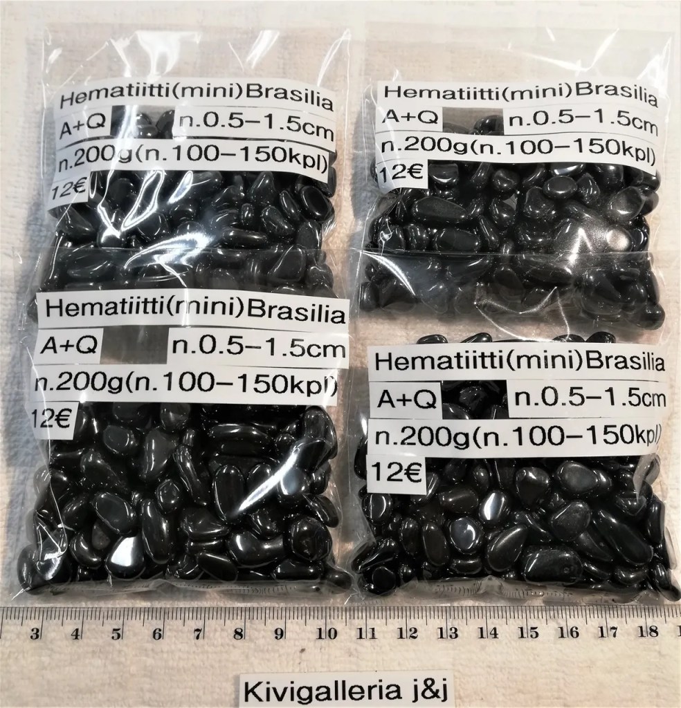 Valmiiksi pussitettuja A+Q-laatuisia Hematiitti minirumpukiviä, koko n. 0,5-1,5cm. Pussi painaa n.200g (100-150kpl). Hematiitti eli verikivi on raudan ja hapen yhdiste. Sana Hematiitti on johdettu kreikan sanasta hemos, joka tarkoittaa verta. Hematiitin perusväri on teräksenharmaa, mutta rapautuessaan se muuttuu verenpunaiseksi. Hematiitin sanotaan olevan maadoittava kivi ja auttavan pääsemään stressistä ja masennuksesta, sitä suositellaan myös unettomuuteen. Hematiitti vahvistaa keskittymistä ja poistaa itse asetettuja rajoituksia ja omaa myös vahvan yang-elementin. Horoskooppimerkkien Kauris ja Kalat onnenkivi. Chakra: Juurichakra Vinkkinä suonenvedosta kärsiville suositellaan laittamaan Hematiitti esim. sukkaan pohkeiden kohdalle.