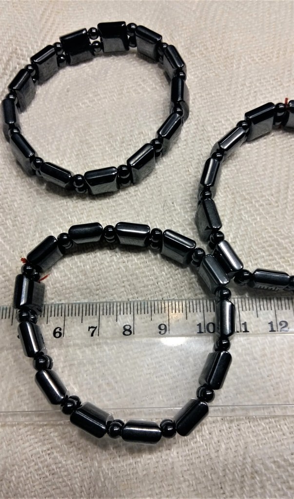 Hematiittilaatoista (n.1x1cm)ja -helmistä (3mm) koottu ranneke, vahva kuminauha. Hematiitin sanotaan olevan maadoittava kivi ja auttavan pääsemään stressistä ja masennuksesta, sitä suositellaan myös unettomuuteen. Hematiitti vahvistaa keskittymistä ja poistaa itse asetettuja rajoituksia ja omaa myös vahvan yang-elementin. Fyysisellä tasolla hematiitti liitetään muun muassa jalkoihin, erityisesti suonenvedosta kärsiviä suositellaan laittamaan Hematiitti esim. sukkaan pohkeiden kohdalle. Horoskooppimerkkien Kauris ja Kalat onnenkivi.