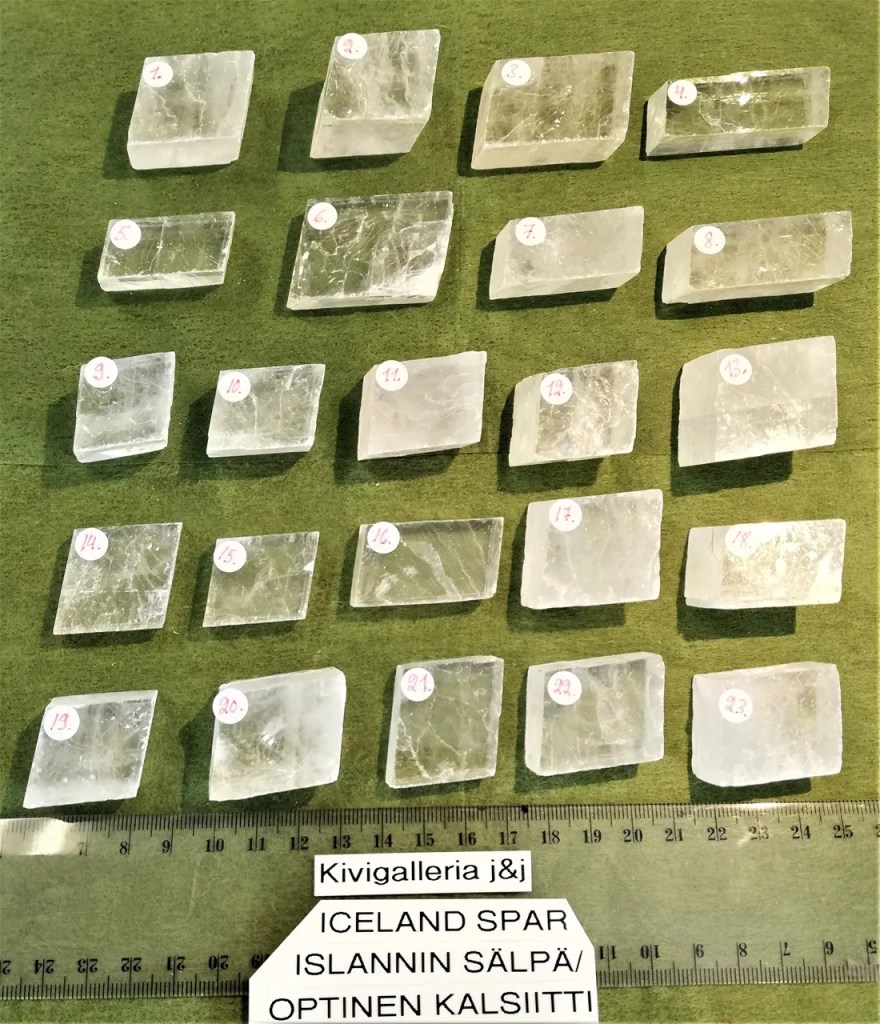 Islanninsälpä / Optinen kalsiitti. Koko n.1-2,5 x 2-3 x 2,8-4,5cm. Muinoin mm. Viikingit käyttivät navigointiin myyttisiä ”aurinkokiviä”. Historioitsijat ovat väitelleet jo hyvän tovin 700-luvulta aina 1000-luvun loppupuolelle kukoistaneen muinaisnorjalaisen merenkulkijakansan, eli viikinkien navigointitavoista. Kenties suosituin selitys sille, miten skandinaaviset purjehtijat suunnistivat menestyksekkäästi pitkillä, pilvisillä sekä sumuverhojen peittämillä kaukoretkillään esimerkiksi Kanadan koillisrannikolle asti, on aurinkokivi. Hypoteettinen, mahdollisesti aurinkokompassina hyödynnetty aurinkokivi eli islanninsälpä on kalsiitin läpinäkyvä mineraalialalaji.(TM/Veikka Niemi 13.9.2017)