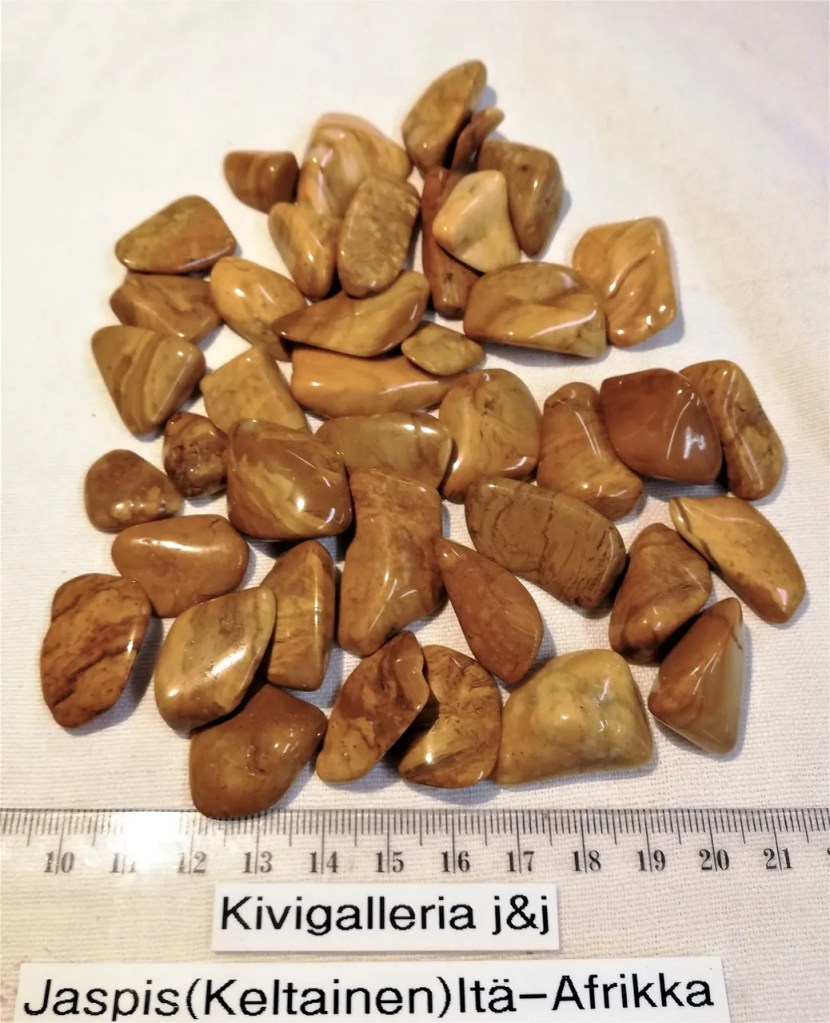 Rumpuhiottu Keltainen Jaspis, koko n. 1,5-2 x 2-3cm Jaspikset ovat monimuotoinen, -kuvioinen ja -värinen kivilaji, jonka nimi tulee kreikankielen täplikästä kiveä tarkoittavasta sanasta. Sitä pidetään kielteisyyttä torjuvana kivenä, joka auttaa myös keskittymään ja viemään asiat päätökseen. Sen uskotaan auttavan luomaan yhteyden luontoon ja maahan. Fyysisellä tasolla Jaspiksen on uskottu auttavan mm. rentouttamaan lihaksia, laukaisemaan kramppeja ja ylipäätään toimivan voimakkaana fyysisenä parantajana.