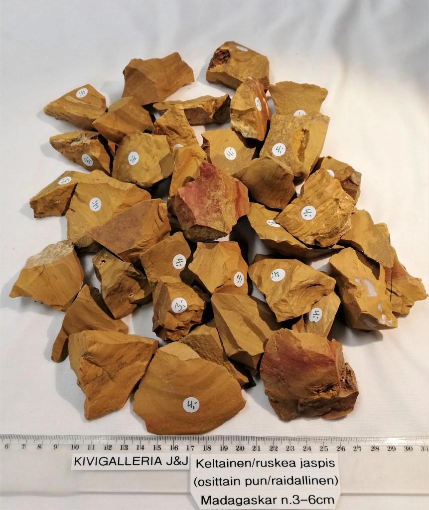 Keltaisen Jaspiksen AQ-laatuisia raakapaloja, koko n. 3-6cm. Jaspikset ovat monimuotoinen, -kuvioinen ja -värinen kivilaji, jonka nimi tulee kreikankielen täplikästä kiveä tarkoittavasta sanasta. Sitä pidetään kielteisyyttä torjuvana kivenä, joka auttaa myös keskittymään ja viemään asiat päätökseen. Sen uskotaan auttavan luomaan yhteyden luontoon ja maahan. Fyysisellä tasolla Jaspiksen on uskottu auttavan mm. rentouttamaan lihaksia, laukaisemaan kramppeja ja ylipäätään toimivan voimakkaana fyysisenä parantajana. Kaikkia Jaspiksia pidetään parantavina, maadoittavina ja kielteisyyttä torjuvina kivinä. Niiden ajatellaan avaavan yhteyden luontoon ja maahan. Jaspiksen maanläheisten sävyjen uskotaan auttavan käyttäjäänsä keskittymään ja viemään asiat loppuun.