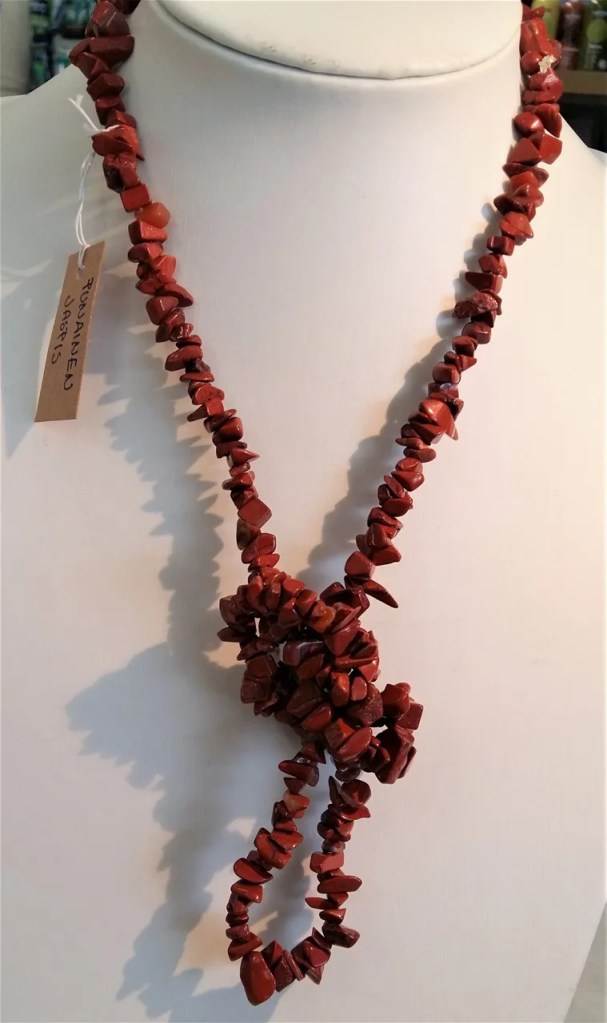 Tumman punaisesta Jaspiksesta tehty kaunis chipsikaulakoru. Pituus n.85cm. Chakra: Juurichakra Jaspis on voimakas fyysinen parantaja. Kivi on tunnettu tuhansien vuosien ajan suojaavasta vaikutuksestaan, se myös tasapainottaa ja maadoittaa agressiivista energiaa. Yksi horoskooppimerkki Kauriin onnenkivistä, myös Oinaan mutkaton, suora ja eteenpäin pyrkivä luonne saa voimaa punaisesta jaspiksesta. Tiilenpunainen jaspis suojasi myös muinoin naissotureita kuvastaen kauneuden ja rohkeuden täydellistä tasapainoa.
