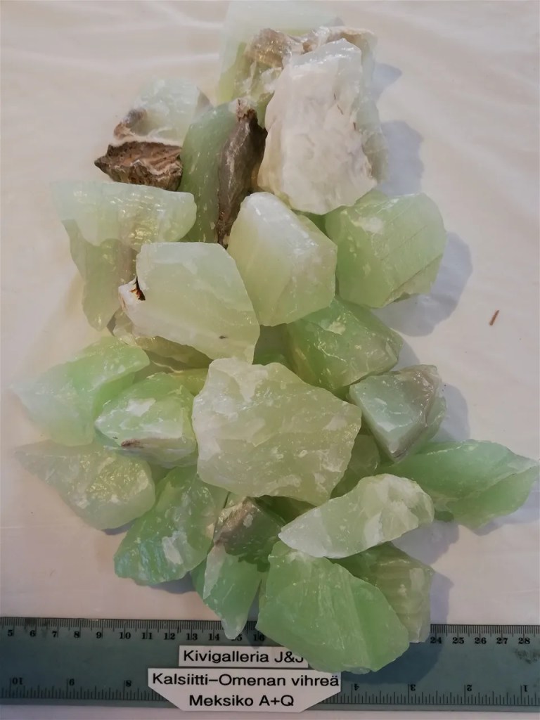 Upeita,omenan vihreitä Kalsiitti raakapaloja.Kivi luo rauhaa ja tyyneyttä ja tasapainoa,säteillen rakkautta ja myötätuntoa.Kivi on myös mentaalinen parantaja joka auttaa vapautumaan vanhoista kaavoista.Omenan vihreä-Kalsiitti on elinvoiman,tarkoituksen ja anteeksiannon kivi,joka stimuloi positiivisia elämän muutoksia ja auttaa antamaan itselleen anteeksi. Kalsiitin energiat säätelee ja parantaa verenpainetta ja voi myös auttaa sydänkohtauksesta toipumisessa.Hyvä myös luustolle ja nivelille,sekä tulehdusten hoidossa.