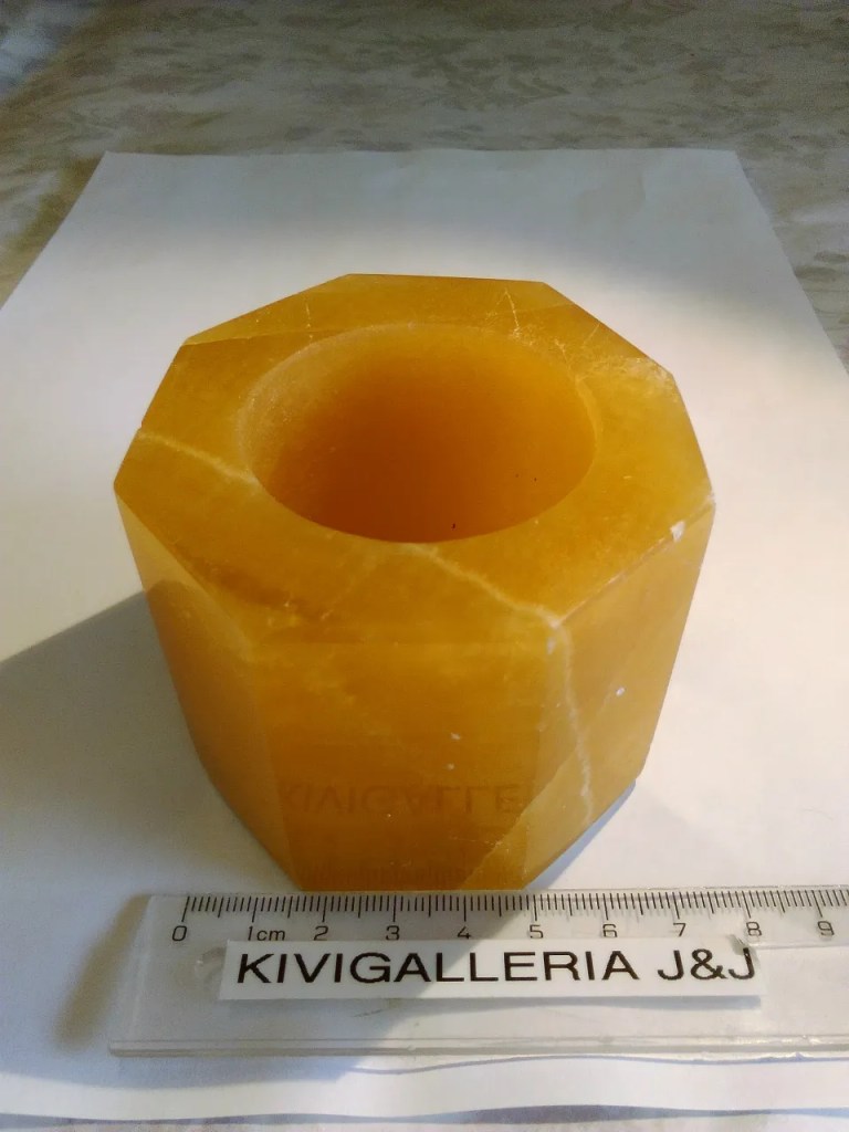 Kahdeksankulmaiseksi hiottu kalsiittituikku, korkeus n. 6cm.