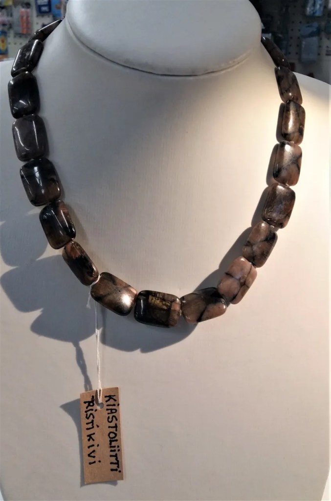 Jännittävästi kuvioitunut Kiastoliitti eli Ristikivi kaulakoru,kivilaatan koko n.1,5 x 2cm. Korun pituus n.45cm, lukko nikkelitöntä korumetallia. Kiastoliitin uskotaan tasapainottavan näkemyksiä ja auttavan ongelmien ratkaisussa. Kivi liitetään myös kuolemaan ja jälleensyntymiseen -kivi saattaa antaa ymmärrettäviä vastauksia mysteereihin. Chakra: Juuri ja Solar Plexus Kiastoliittia suositellaan käytettäväksi kaulassa kaulakoruna tai riipuksena.