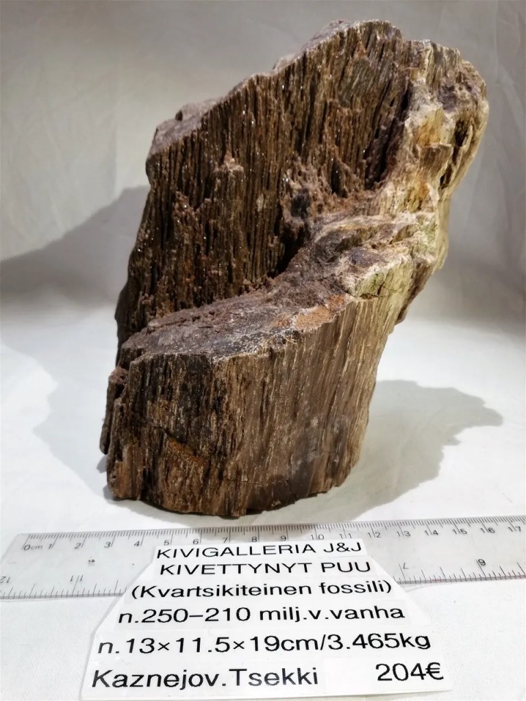 250-210 milj. vuotta vanha Kivettynyt puu Tsekeistä Kaznejovin alueelta. Kvartsikiteet erottuvat hyvin tässä fossiilissa. Koko n.13×11,5x19cm ja paino 3.465kg. Kivettynyt puu muodostuu aikojen kuluessa orgaanisen puumateriaalin korvaantuessa mineraaliaineksella. Kivettynyt puu on siten mineralogisesti kalsedonia, jossa jopa puun alkuperäinen rakenne vuosirenkaineen on selkeästi havaittavissa. VOIMA: Yhteys luontoon ja maahan, poistaa vähäisiä ärsytyksiä ja auttaa pitämään asiat järjestyksessä.