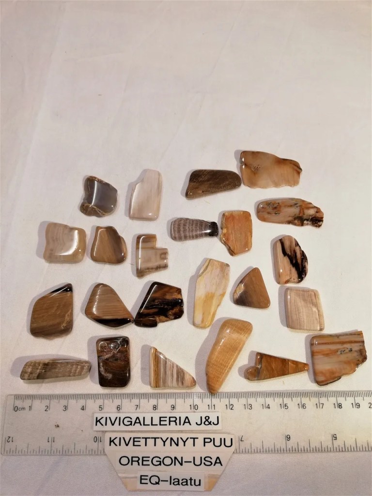 Käsin hiottuja/kiilloitettuja kivettyneen puun paloja. Laatuluokka EQ- eli parasta laatua. Koot vaihtelevat palan muodon mukaan n.1-4cm ja paksuus 0,3-0,5cm. Kivettynyt puu muodostuu miljoonien vuosien kuluessa kun maakerroksiin hautautuneen puumateriaalin korvaavat mineraalit. Löydettäessä kivettyneestä puusta on nähtävissä kaikki rungon muodot ja jopa kaarna. Toisissa on selvästi laskettavissa myös vuosirenkaat. Nähtävissä on hyvin minkälainen ”elävä” puu oli.
