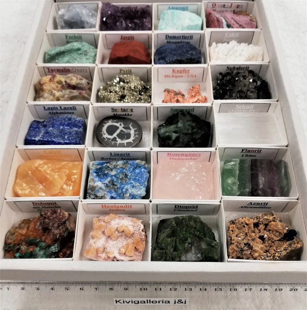 Kokoelmassa on 24 erilaista kiveä 4 x 5cm laatikoissa. Koko laatikko on kooltaan n. 23 x 29cm ja kokonaispaino kokoelmalla on n. 1.100kg. Kaikki kivet on nimetty, lisäksi on merkitty maa mistä ne ovat lähtöisin. Mukana mm. Heulandiitti, Azuriitti, Dolomiitti/Malakiitti, Septaria, Valtamerijaspis…