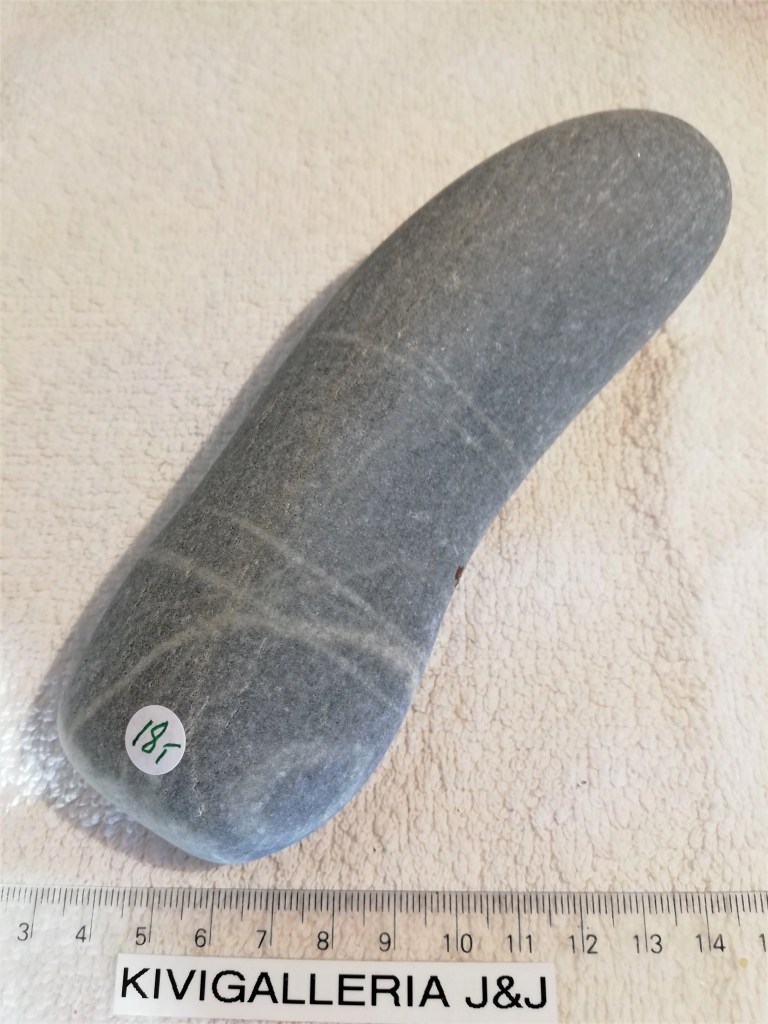 Luonnon muovaama kivipuikko, koko n.5x15cm ja paino 470g. Jäämeren aaltojen vuosisatojen kuluessa muovaamaa kiilleliusketta. Pyöreäksi hioutuneine muotoineen sopii hyvin käteen. Nämä isommat ja litteämmät sopivat erinomaisesti esim. kuumakivihoitoihin.