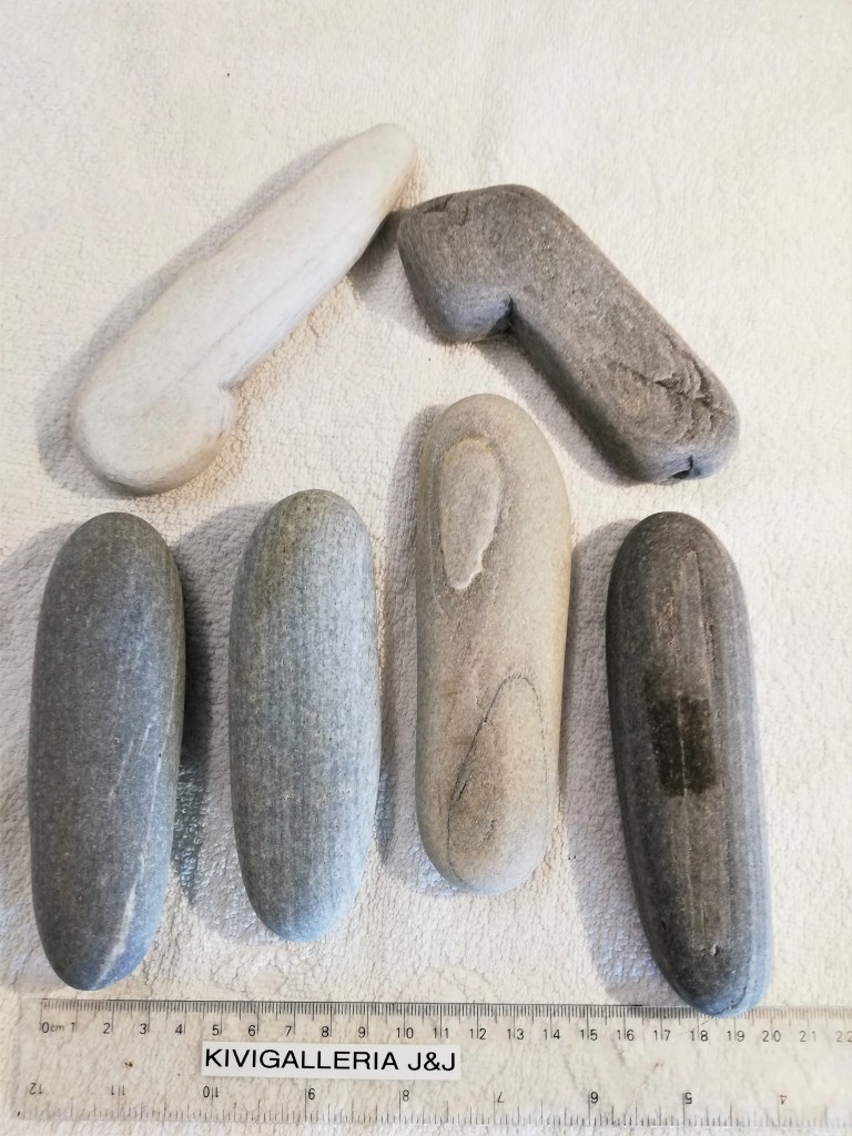 Luonnon muovaamat kivipuikot hierontaan ja kuumakivi hoitoihin, pituus n.12-14cm. Jäämeren aaltojen vuosisatojen kuluessa muovaamia kiilleliuske kiviä. Pyöreäksi hioutuneine muotoineen sopivat hyvin käteen. Nämä isommat ja litteämmät sopivat erinomaisesti esim. kuumakivihoitoihin.