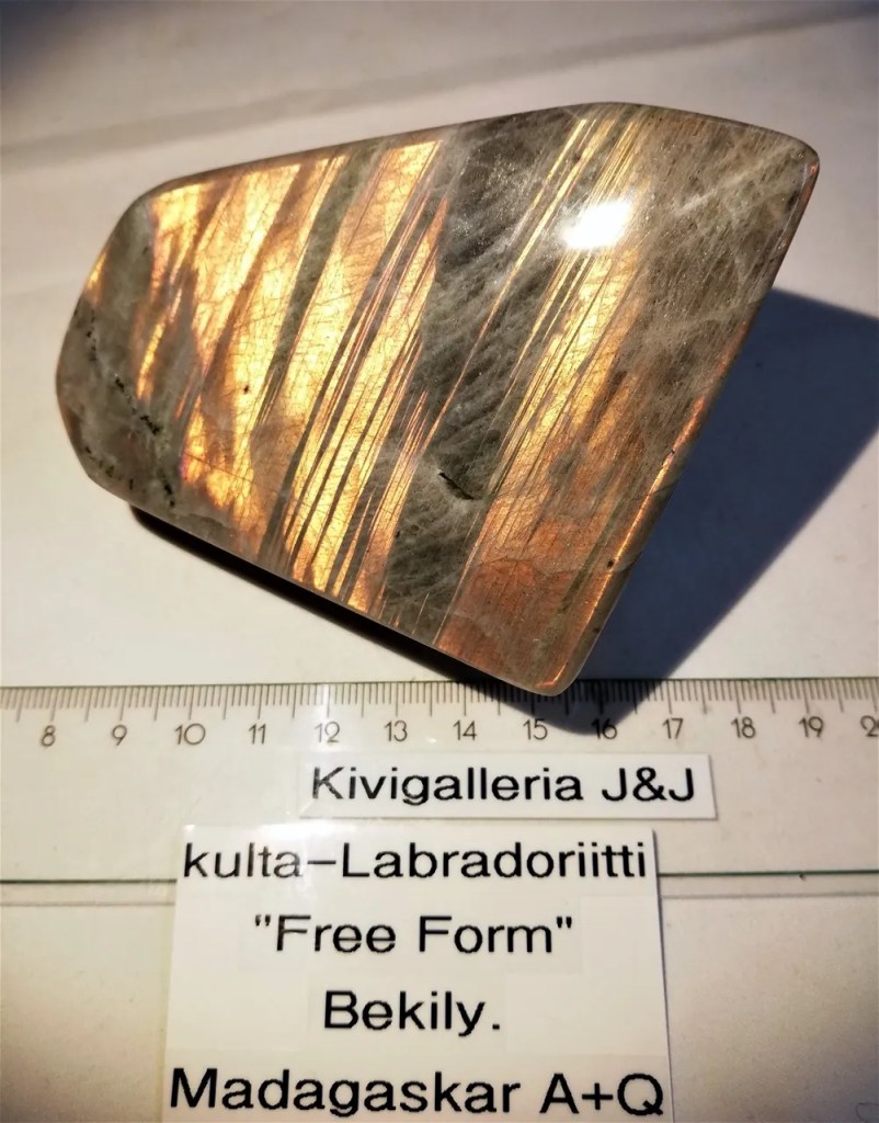 Kulta-labradoriitti 3. koko 4 x 7 x 8cm ja paino 437g. Käsin hiottu/kiilloitettu.